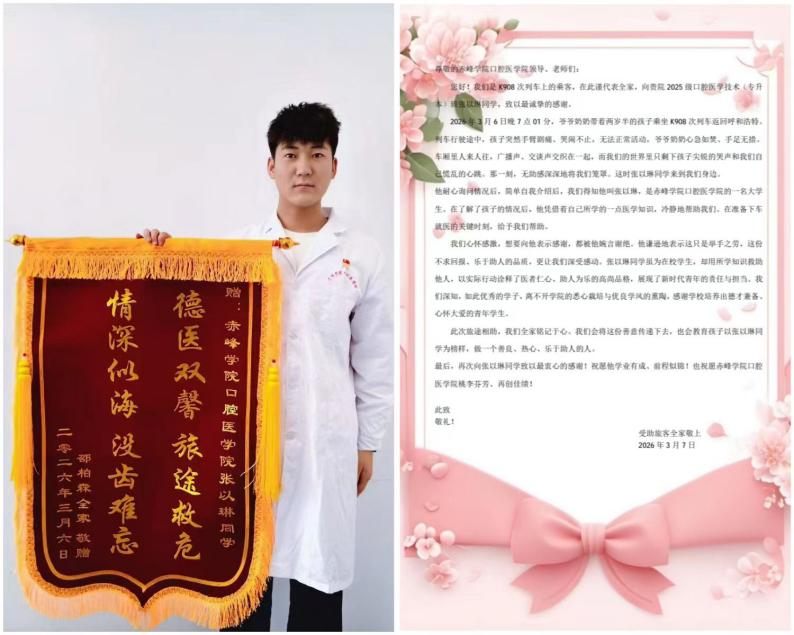 活动一:3月初,K908次列车上一名两岁半幼童突发疾病。口腔医学院2025级口腔医学技术(专升本)班学生张以琳,利用医学知识和退伍军人的应急能力成功援助患儿,近日患儿家属向其赠送锦旗致谢。张以琳同学的善举彰显了口腔医学学院学子良好的精神风貌和过硬的综合素质。