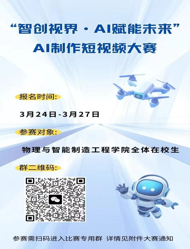 赤峰大学物理与智能制造工程学院发布举办AI制作短视频大赛的通知,旨在通过赛事促进学生科技创新能力与艺术素养的融合提升。
