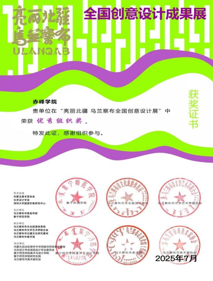 近日,美术学院组织学生参加“亮丽北疆 乌兰察布”全国设计创意大赛,选送35件作品。学生在文创类别中获多个奖项,教师获优秀指导教师,赤峰学院获优秀组织奖。活动展示学院实践教学成果与学生专业素养,美术学院将继续以赛促学推动专业建设与地方文化结合。