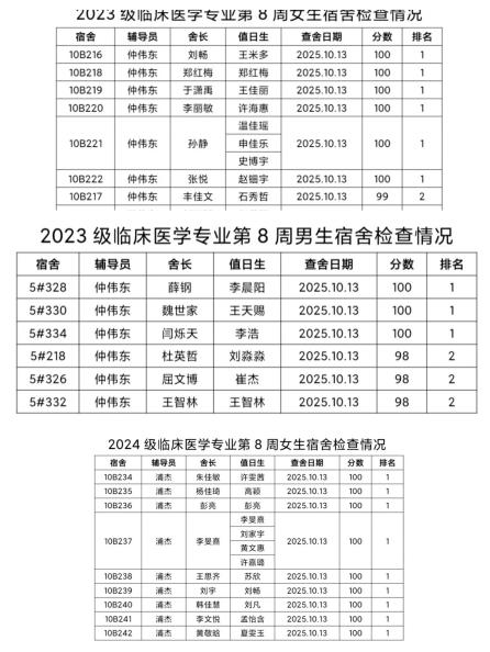 为落实赤峰学院学生公寓卫生要求,强化宿舍安全管理、掌握卫生情况,临床医学院学生会及各组织于第8周,对2023级、2024级、2025级学生宿舍开展安全排查与内务检查,现将结果公示如下