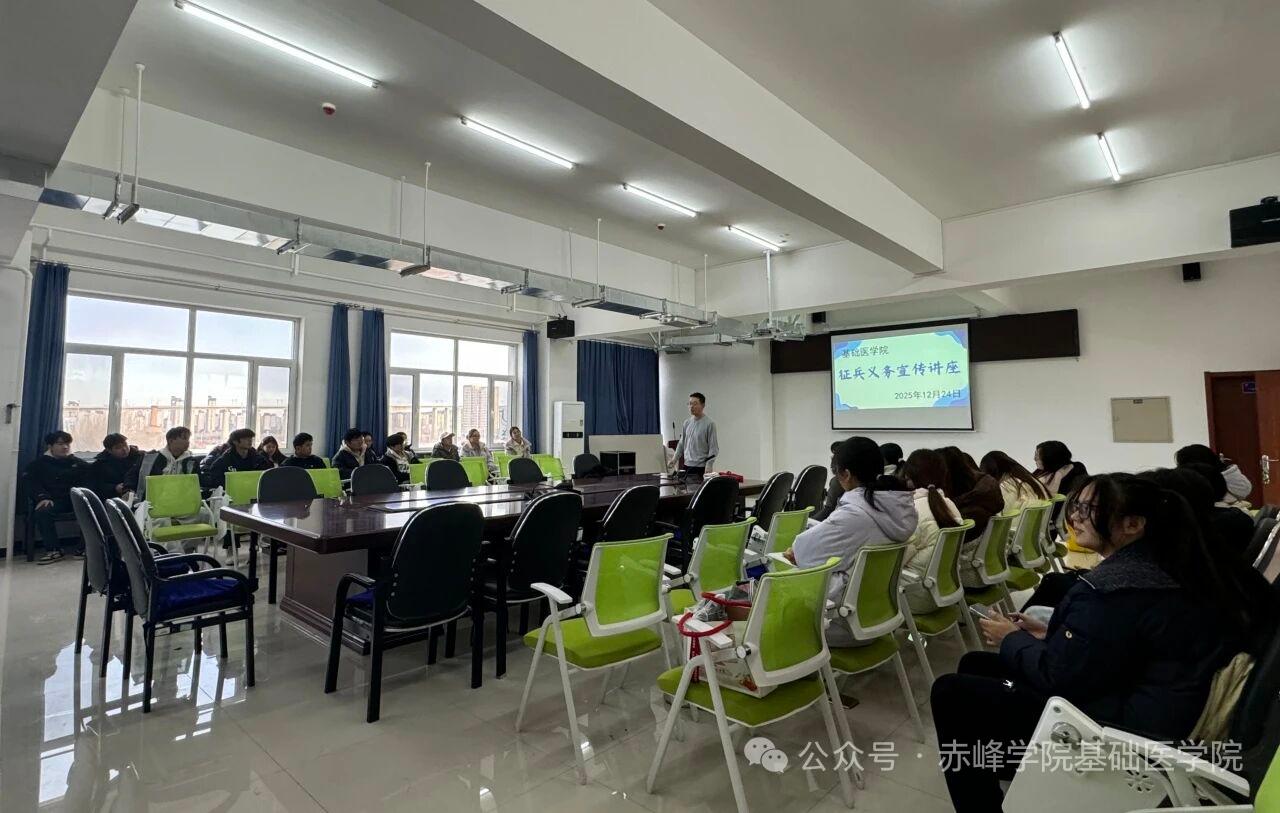12月24日,基础医学院在崇理楼C636会议室举办征兵宣讲。学生处张晨赫老师详细解读了征兵政策、报名流程及优待政策,并现场答疑。基础医学院党总支副书记姜晓东鼓励同学们将个人理想融入强军事业。此次讲座有效增强了学生的国防意识,激发了参军热情。