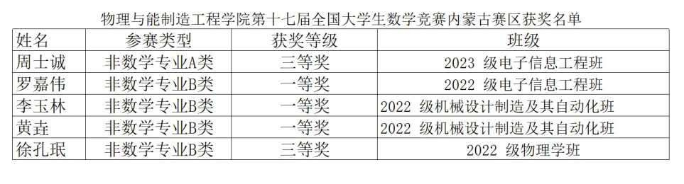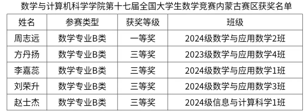 12月23日,第十七届全国大学生数学竞赛内蒙古赛区结果公布,数学与计算机科学学院5名学生获奖,其中数学专业B类一等奖1项、三等奖4项,展现了学生扎实的数学基础与良好素质。此次竞赛激发学生学习兴趣提升了学生的综合能力体现了数学与计算机科学学院在人才培养和教学质量方面的成效。