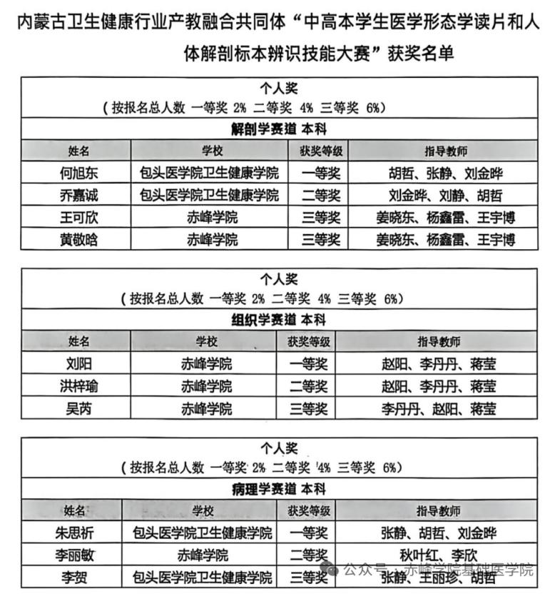 12月24日,基础医学院学生在内蒙古卫生健康行业产教融合共同体举办的“中高本学生医学形态学读片及人体解剖标本辨识技能大赛”中表现优异,荣获解剖学三等奖项、组织学一等奖项及二三等奖各项、病理学二等奖项。此次成绩展示了基础医学院教学改革与实践育人的成效。未来基础医学院将继续以赛促教、以赛促学,为培养高素质卫生健康人才提供支撑。