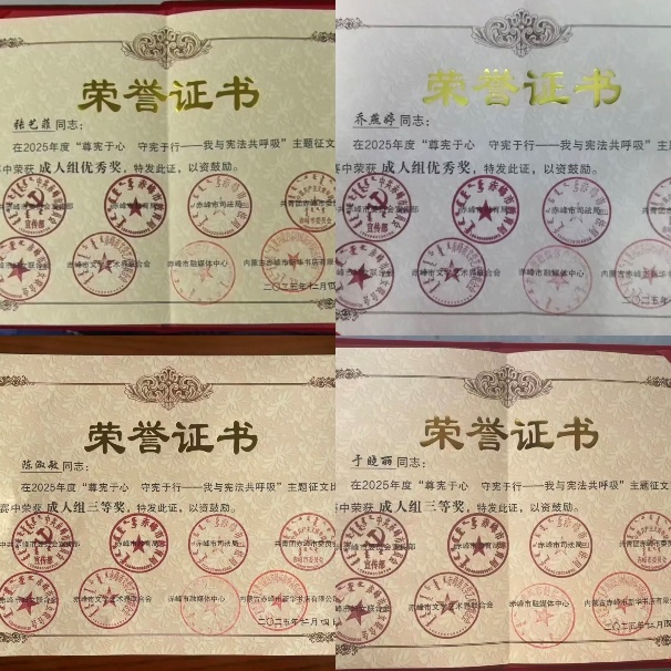 11月22日,赤峰市举办“尊宪于心,守宪于行——我与宪法共呼吸”主题征文比赛,在12月23日获奖结果公布中,法学与商务学院学子表现突出。参赛学生紧扣主题,最终于晓丽、陈淑敏获三等奖,乔燕婷、张艺菲获优秀奖。此次获奖是对学生能力的肯定,也是法学与商务学院深耕法治教育、注重知行合一培养模式的体现,未来法学与商务学院将常态化开展法治教育活动,为法治建设输送更多青年力量。