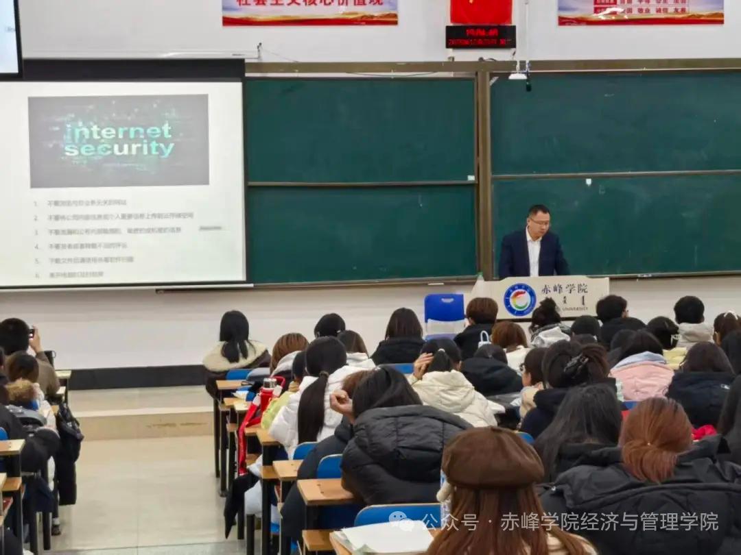 12月22日晚,经济与管理学院邀请金融街证券投资顾问陈天罡在崇学楼作网络安全讲座。陈顾问讲解了网络安全的重要性、常见电信诈骗手段及防范方法,并回答学生提问。讲座有效提升了学生的网络安全意识和风险防范能力。