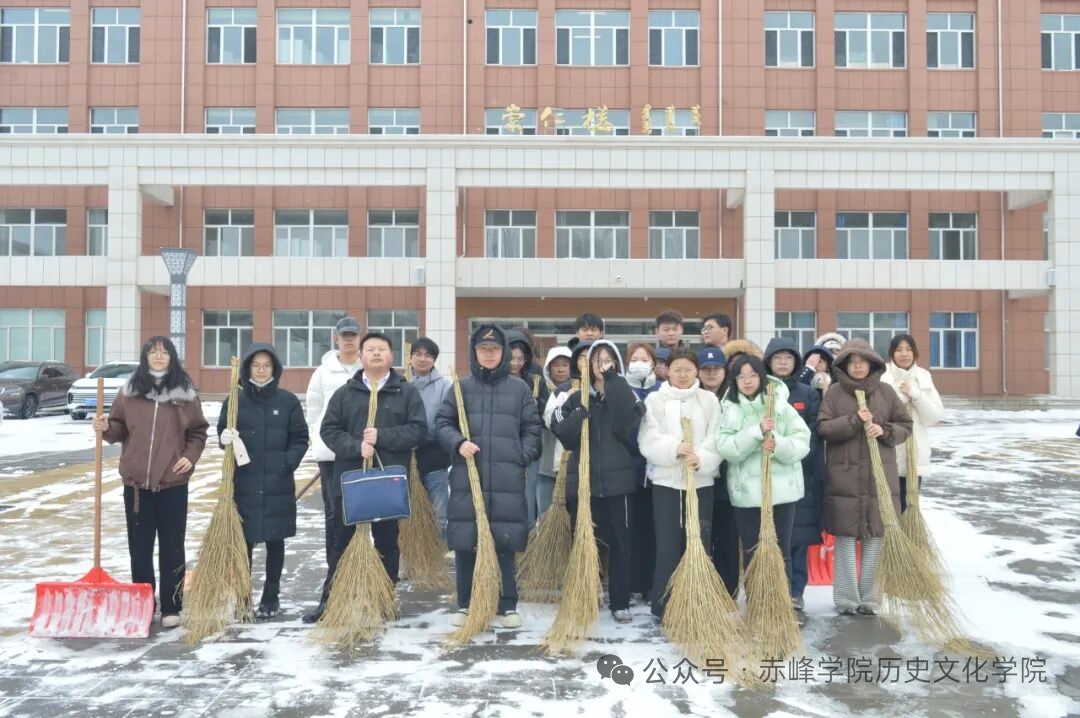3月5日,第63个学雷锋纪念日,历史文化学院团总支在崇仁楼前广场开展校园扫雪志愿服务活动。志愿者们不畏严寒、分工协作,认真清理路面积雪与冰碴,保障师生出行安全。
