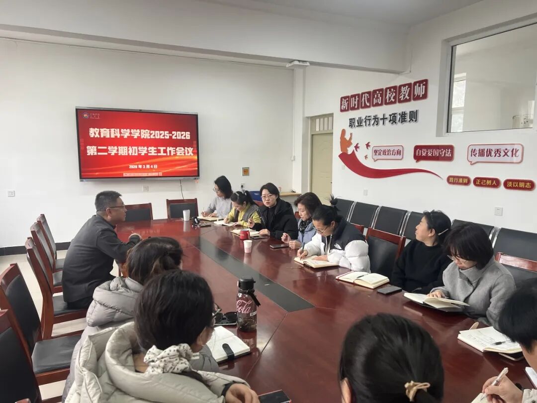3月4日下午,教育科学学院在崇文楼205会议室召开2026年春季学期学生工作会议,传达学校相关会议精神,部署新学期重点工作。张宏伟书记出席,张鹏展副书记主持,全体辅导员参会。此次会议统一思想、明确任务,为教育科学学院新学期学生工作高质量开展奠定了坚实基础。
