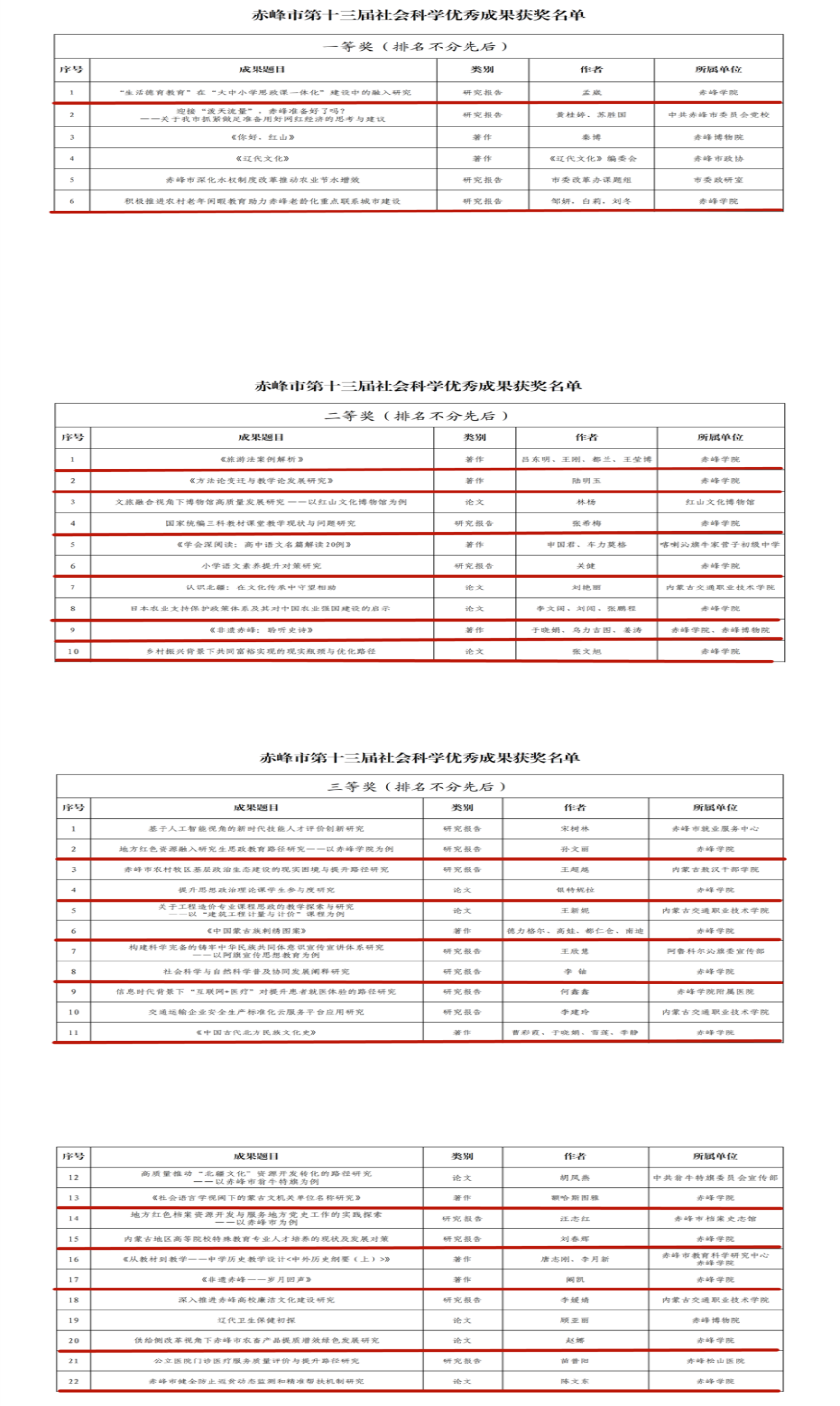 近日,赤峰市人民政府公布了《关于评选奖励赤峰市第十三届社会科学优秀成果的决定》,全市共评选出38项高质量社科科研成果。我校凭借深厚的科研积累与扎实的研究实力斩获19项奖项,其中,一等奖2项、二等奖7项、三等奖10项,获奖总数占全市总获奖数的50%,实现成果数量与质量的双重突破。