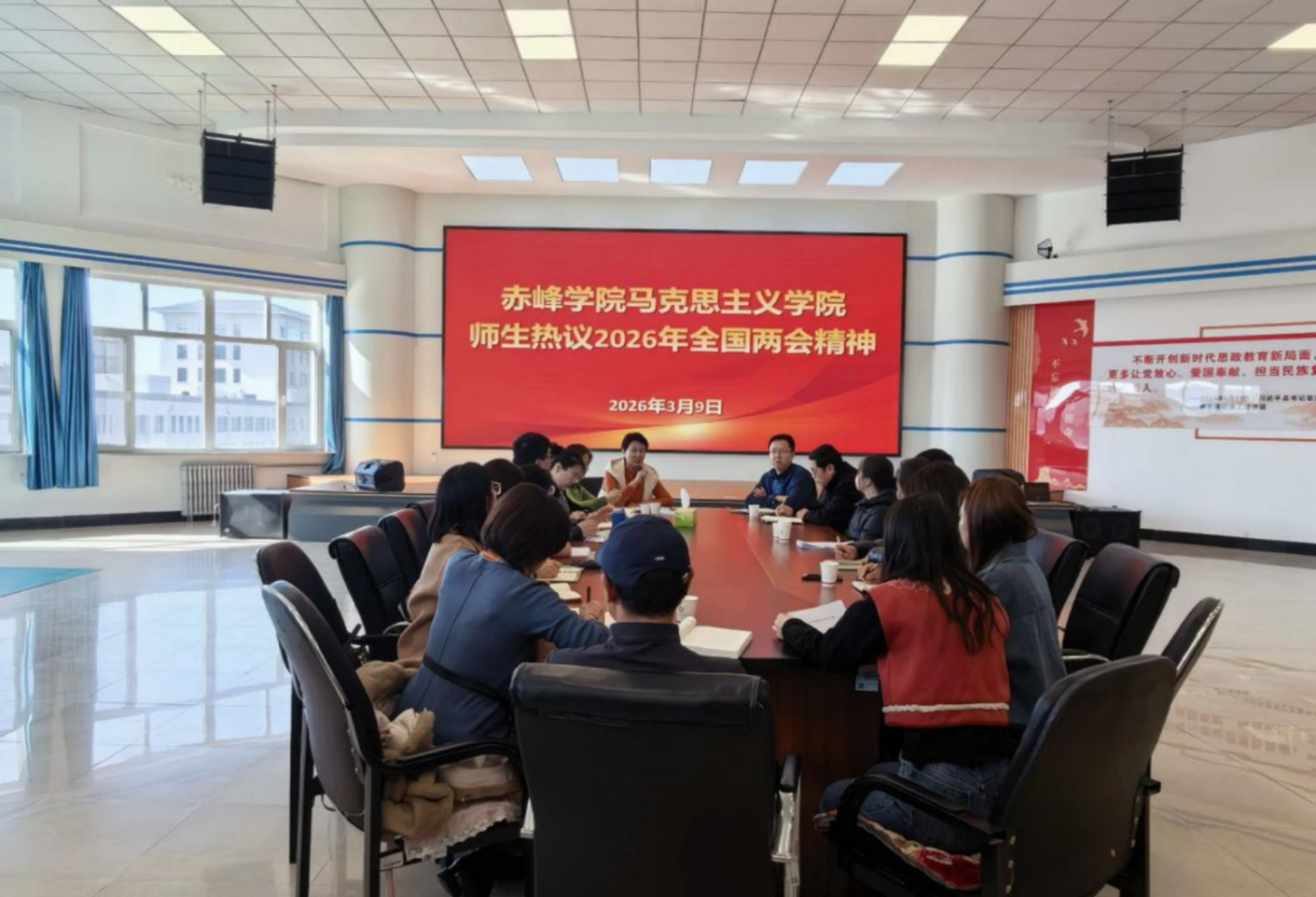 活动一:3月9日,马克思主义学院组织思政课教师与学生代表开展两会精神专题学习研讨。教师们结合教学心得,提出将两会精神、新质生产力等融入思政课堂;学生代表结合学习生活谈感悟,建言课程实践与校园建设。此次研讨深化了师生对两会精神的理解,马克思主义学院将持续推动学习成果转化,落实立德树人的教育精神。
