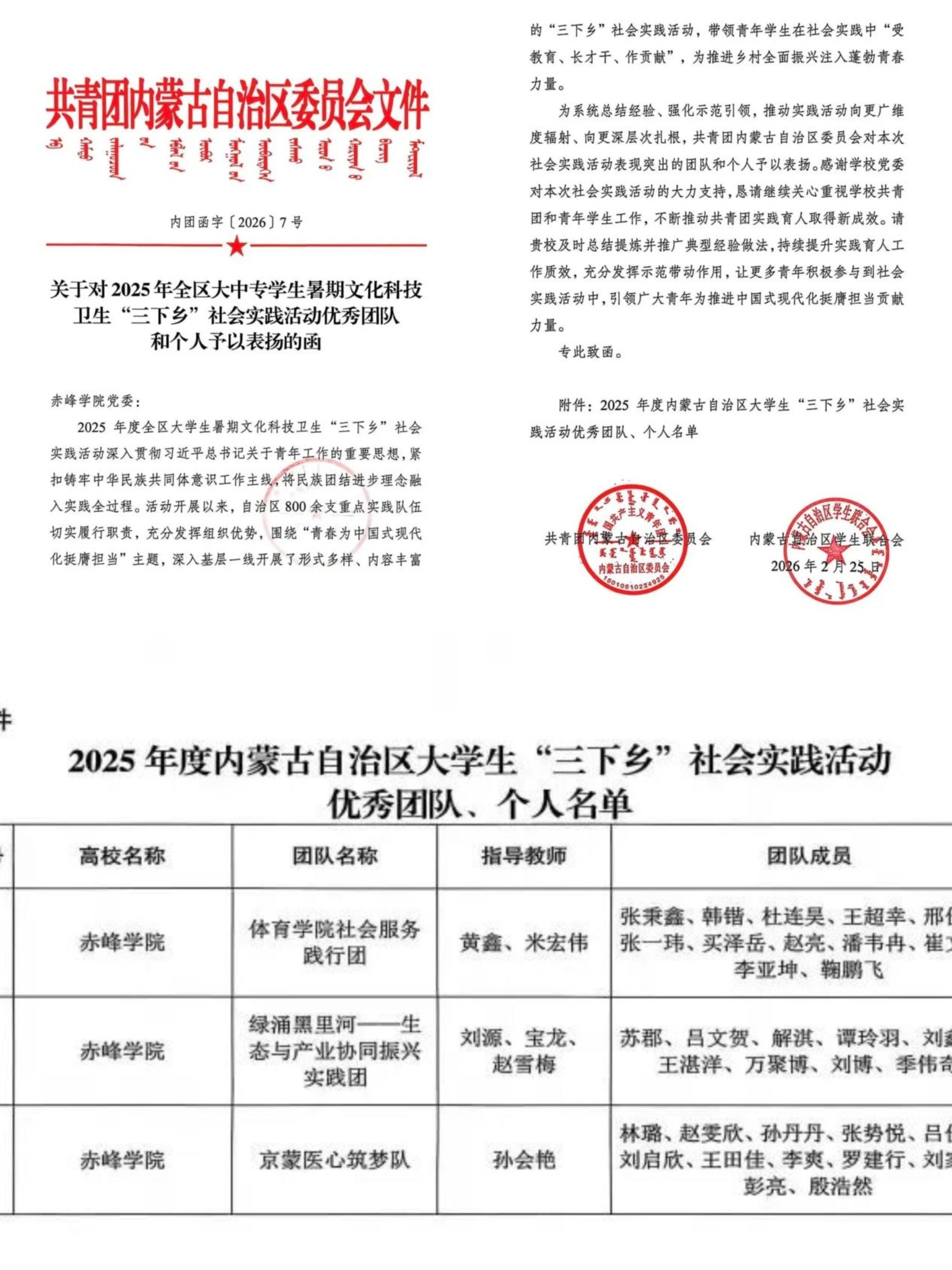 活动三:近日,临床医学院“京蒙医心筑梦队”在孙会艳老师的指导下,开展了“三下乡”基层医疗服务与健康科普实践,荣获自治区优秀团队。该荣誉彰显了临床医学院实践育人成果,激励学子服务基层、奉献青春。