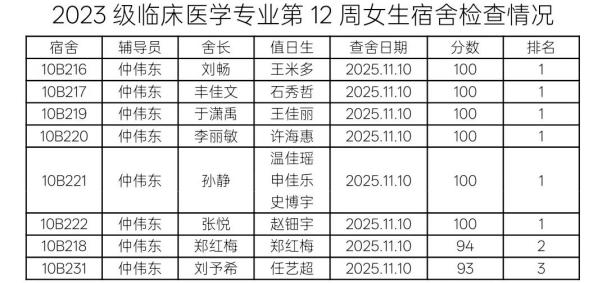 11月11日,为落实《赤峰学院学生公寓卫生管理办法(试行)》等要求,临床医学院学生会及相关组织于第12周,对2023级至2025级校本部学生宿舍开展安全排查与内务检查。此次检查重点关注用电安全、卫生状况等,公示了优秀宿舍及存在床头悬挂衣物、无人时插排未断电等问题的宿舍,旨在营造安全、整洁、文明的住宿环境。