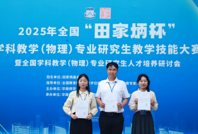 11月6日至9日,2025年全国“田家炳杯”教育硕士物理学科教学技能大赛决赛在华南师大举办。我校物理与智能制造工程学院3名研究生入围全国决赛,最终朱学山、顾恩铭获三等奖,段新雨获优秀教学设计奖,彰显我校研究生教学素养与培养成效。