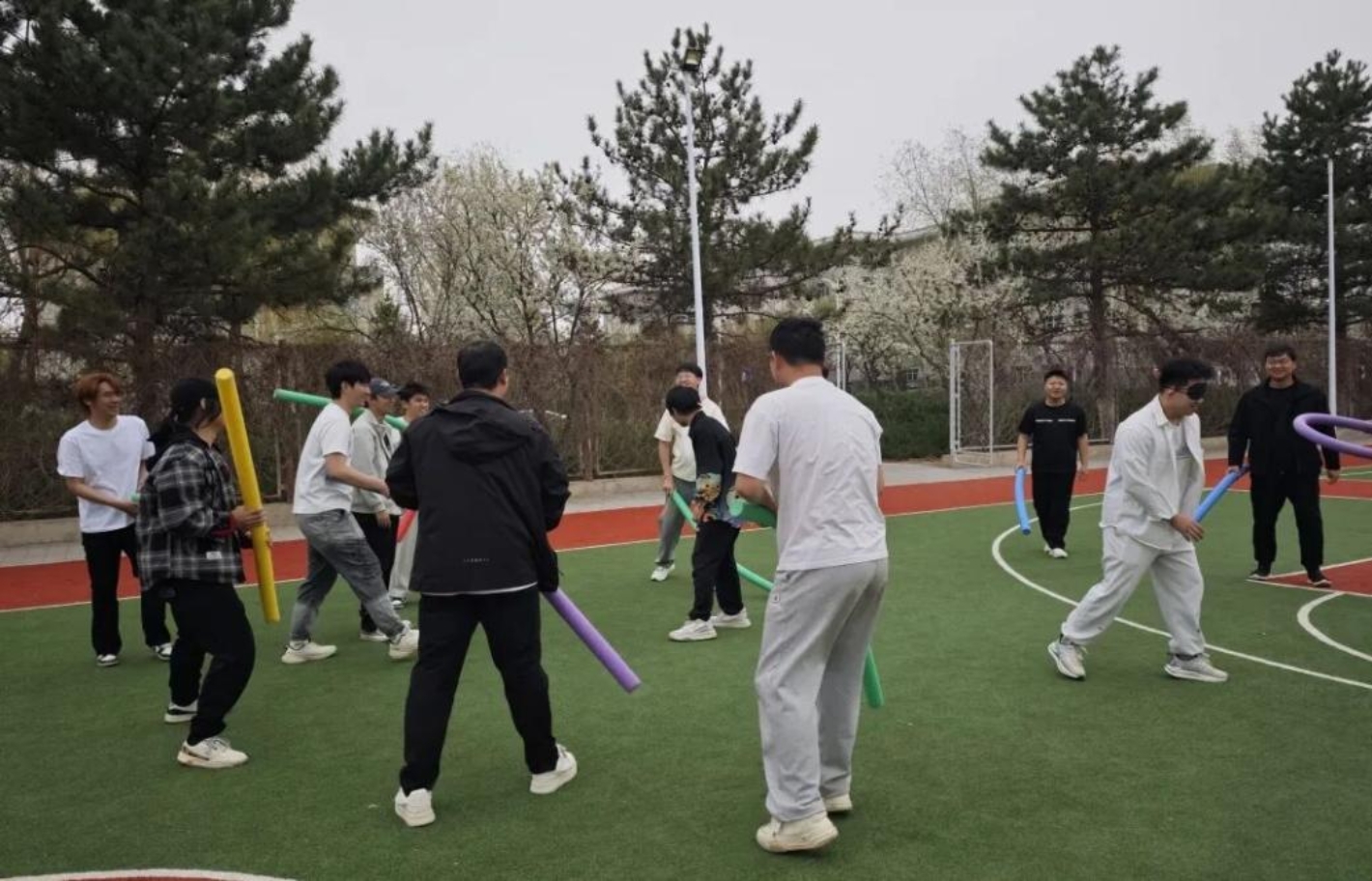 嘿,我可是点燃全场气氛的游戏!当中间的同学戴上了眼罩时,大家拿着海绵棒开启了“互打”模式。如果周围同学手中的海绵棒被抓到了,那么就要互换身份,该活动主打热情欢快。伴随着主带人放的音乐,现场瞬间变成欢乐的游戏派对,特别嗨!