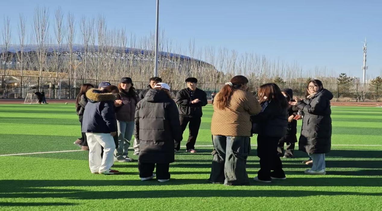 “穿越森林”是突破时空乱流的冒险。设置起点和终点,每组成为一艘星际飞船,组员化作飞船部件,后一人手搭前一人肩膀,构建成通道。最后一人化身“穿行者”,蛇形穿越通道,引领飞船前行。最后抵达的飞船将面临“能量亏损”惩罚。