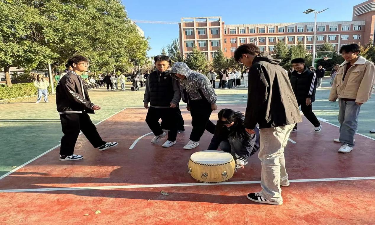 盲人敲鼓,蒙着眼睛的同学身边拥满了人,分别是帮助他的队友和阻止他到达终点敲击鼓面的对手。进入本次素质拓展活动的高潮部分,同学们依旧是非常有激情的投入当中。