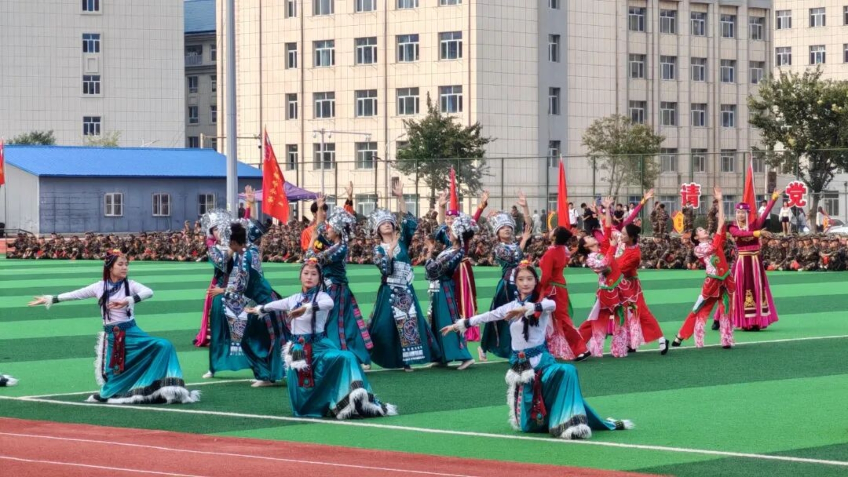 新生开学典礼暨军训总结表彰大会结束后,还上演了舞蹈《民族团结花盛开》、民族健身操《共舞盛会》、诗朗诵《有一盏灯》、大合唱《歌唱祖国》等精彩的文艺节目。