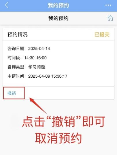 2.若因个人原因无法如期进行咨询,请提前在APP上取消预约或更改预约时间,以便将名额留给其他有需要的同学。