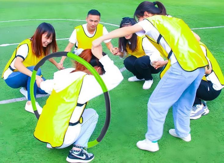 进入第三关的组别每组第一个成员手持呼啦圈,全体玩家手拉手不能松开。通过身体的扭动、钻圈等动作,让呼啦圈在不借助手的情况下,穿过每个玩家的身体,依次传递到下一位玩家直至回到起点。