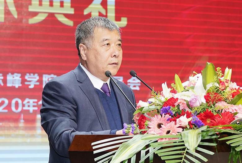 荣休教职工代表赵学富,在职教职工代表、历史文化学院院长孙永刚分别在典礼上发言。