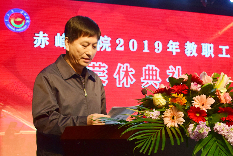 于毅夫副书记在典礼上讲话,他表示,学校第一次以举行仪式的方式对退休教职工致敬和慰问,既是诚挚感谢他们为国家高等教育事业、为学校办学发展所做出的突出贡献,同时也是弘扬尊师重教好风尚,团结凝聚全体赤峰学院人共谋发展、共建赤峰大学的有力举措。希望各位荣休的教职工能从这样的仪式中找到终身做赤峰学院人的归属感和荣耀感,继续一如既往地关心、支持学校的事业发展,积极为学校的改革建设建言献策;希望全校在职教师以此次典礼为契机,弘扬尊师重教的美德,向前辈学习、向前辈致敬,守好立德树人之初心,担好教育强国之使命,在赤峰大学的建设历程中敬业笃志、厚积薄发。