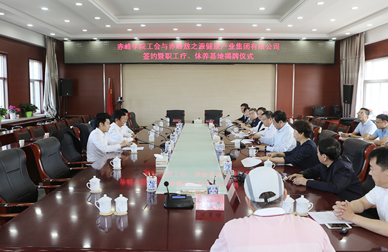 6月10日上午,我校工会与赤峰敖之源健康产业集团有限公司合作签约暨赤峰学院职工疗休养基地揭牌仪式在崇正楼五楼会议室举行。校长雷德荣、党委副书记于毅夫出席仪式。相关职能部门负责人、部分二级学院党政负责同志参加了仪式。仪式由校地合作处处长齐建萍主持。