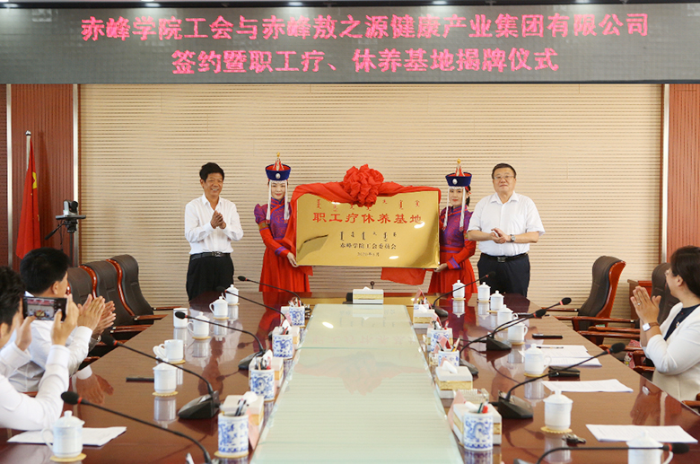 仪式上,雷德荣校长与赤峰敖之源健康产业集团有限公司总裁王汝江共同为“赤峰学院职工疗、休养基地”揭牌;校工会主席孙惠春与敖之源健康产业集团有限公司董事长李树强作为校企双方代表共同签署合作协议。