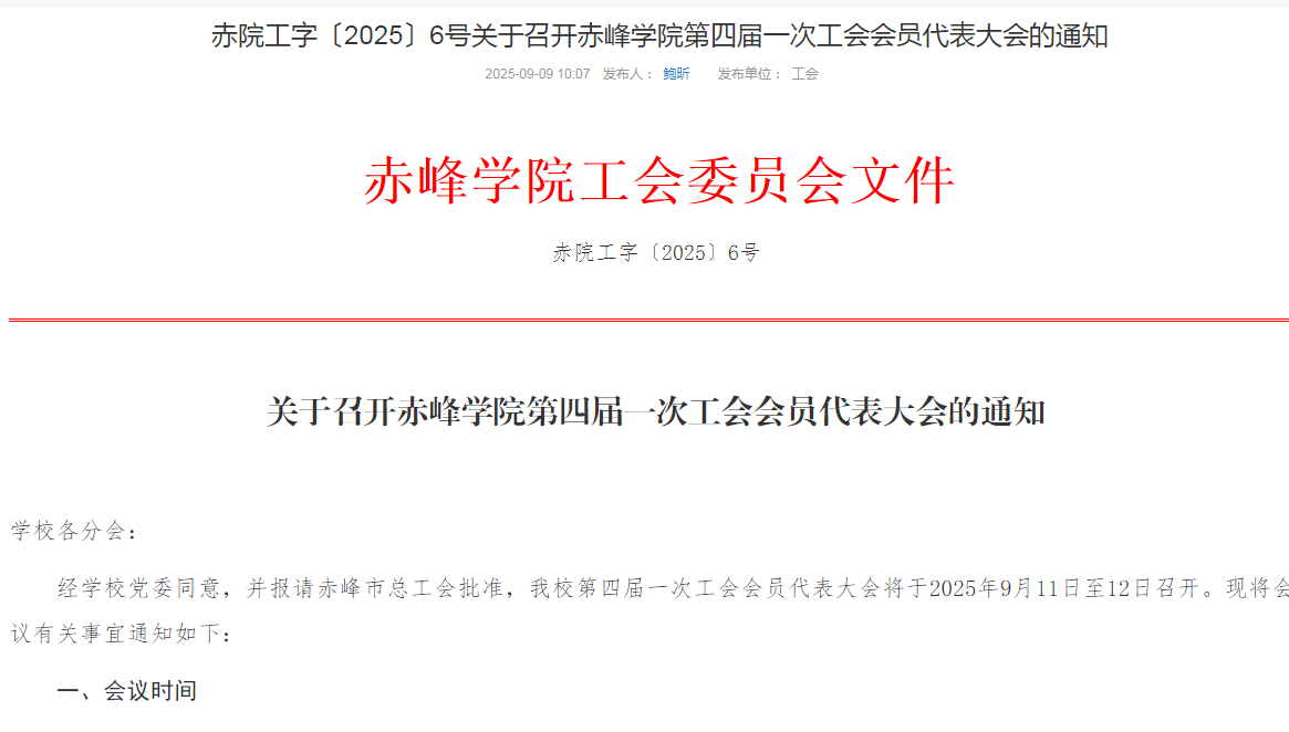 赤院工字〔2025〕6号 关于召开赤峰学院第四届一次工会会员代表 大会的通知