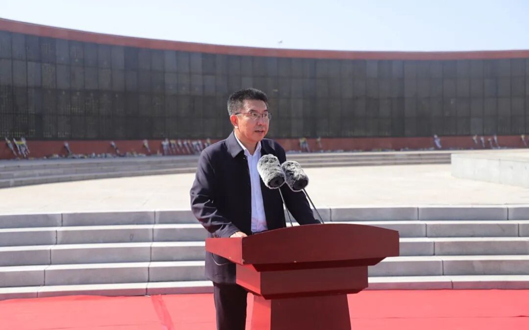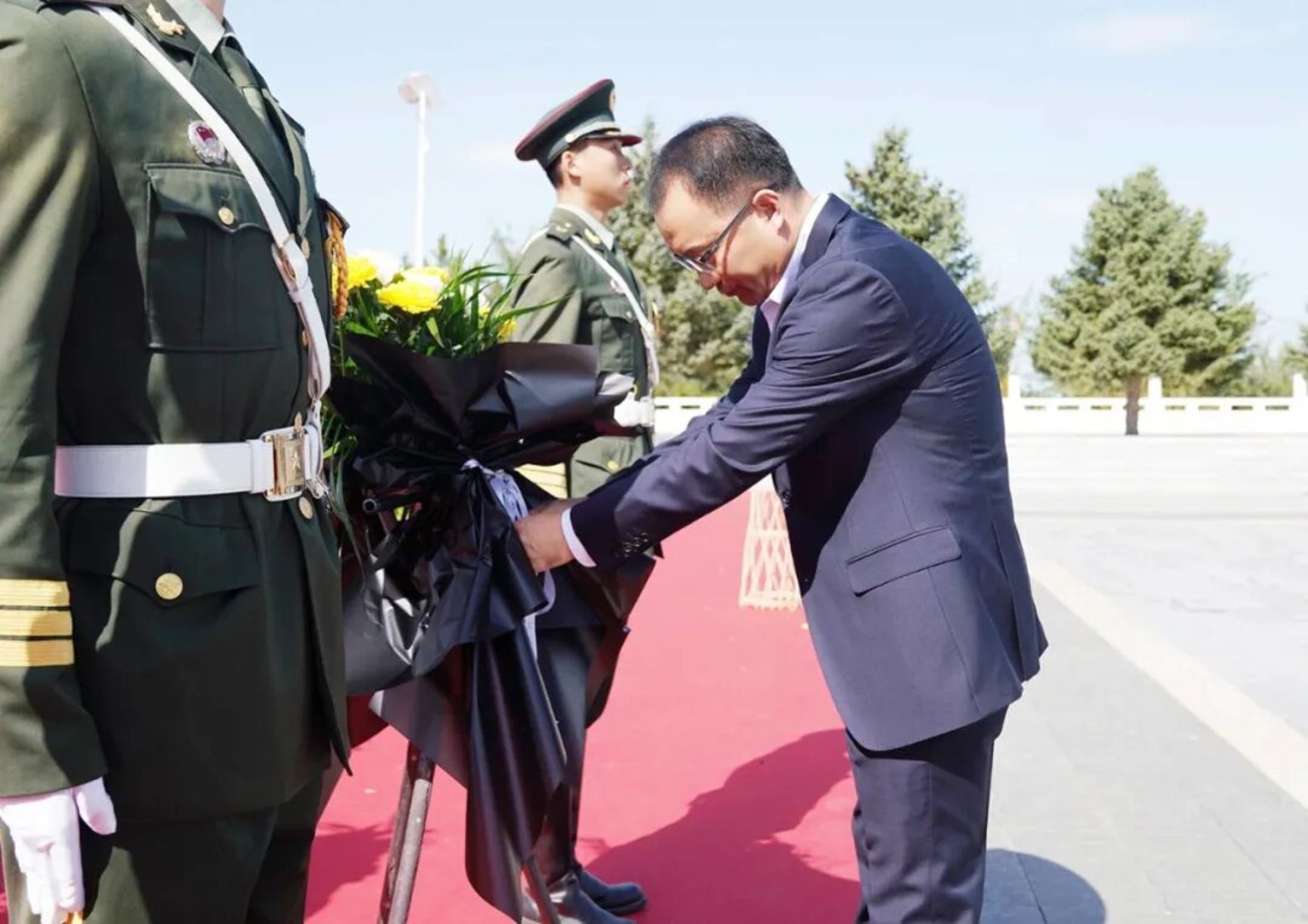 祭扫期间,全体人员脱帽肃立,齐唱中华人民共和国国歌,激昂旋律在陵园上空回荡,每一句歌词都凝聚着师生对祖国的赤诚与对英烈的追思;国歌奏毕,众人为牺牲的革命烈士默哀后,集体鞠躬,用无声的仪式告慰英烈忠魂;随后,大学生国旗护卫队手捧花篮稳步走向纪念碑,将承载着深切缅怀的花篮敬献于烈士面前,校党委副书记、校长季祥上前细心整理花篮缎带,满含对先烈的崇高敬意;最后,历史文化学院2022级考古学专业的宋明达作为学生代表,结合英烈事迹,讲述新时代青年的责任担当,真挚的话语引发在场人员强烈共鸣,让英烈精神在交流中进一步传递。