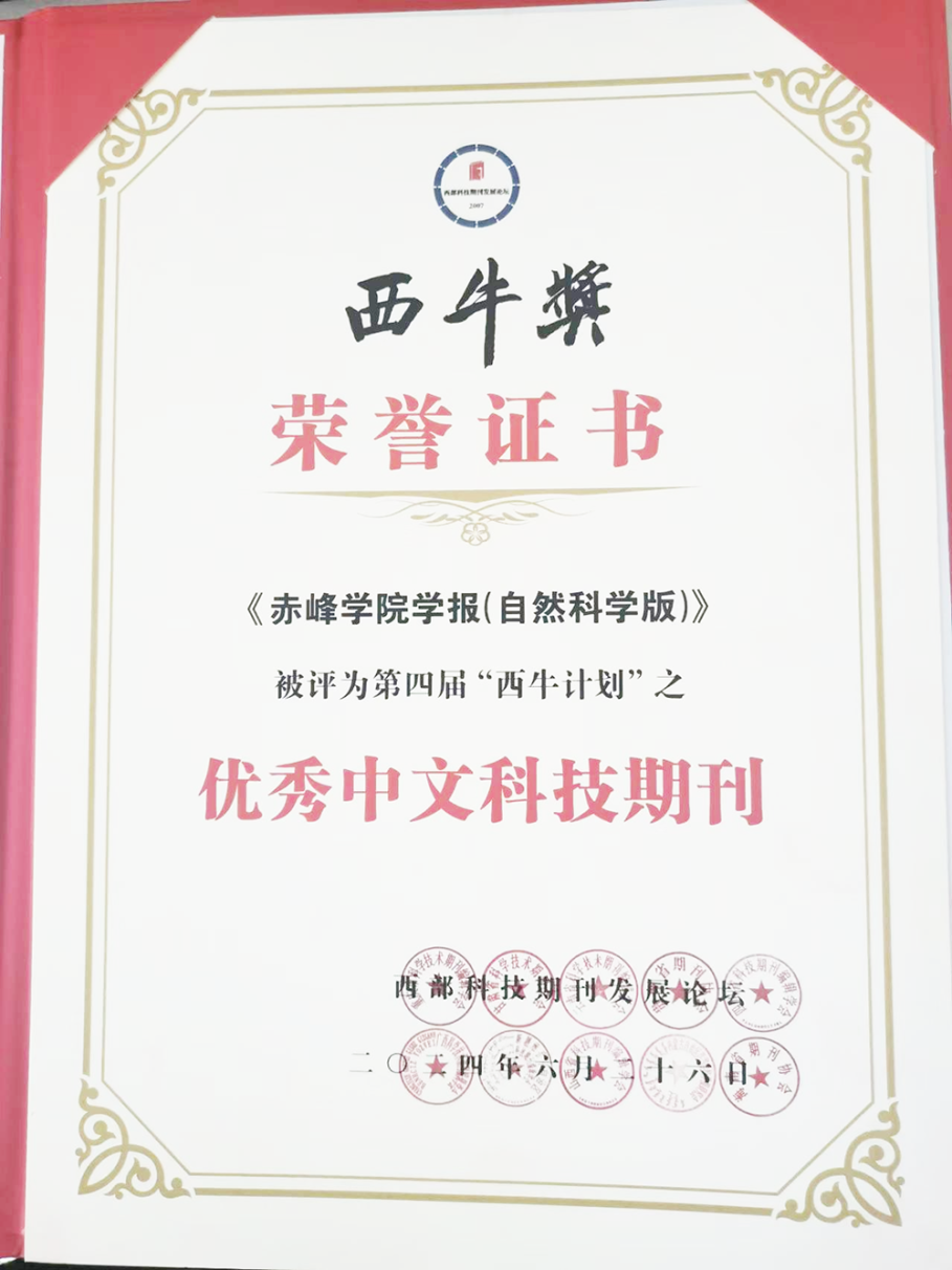 《赤峰学院学报》(自然科学版)荣获2024年度第四届“西牛计划”“优秀中文科技期刊”荣誉称号