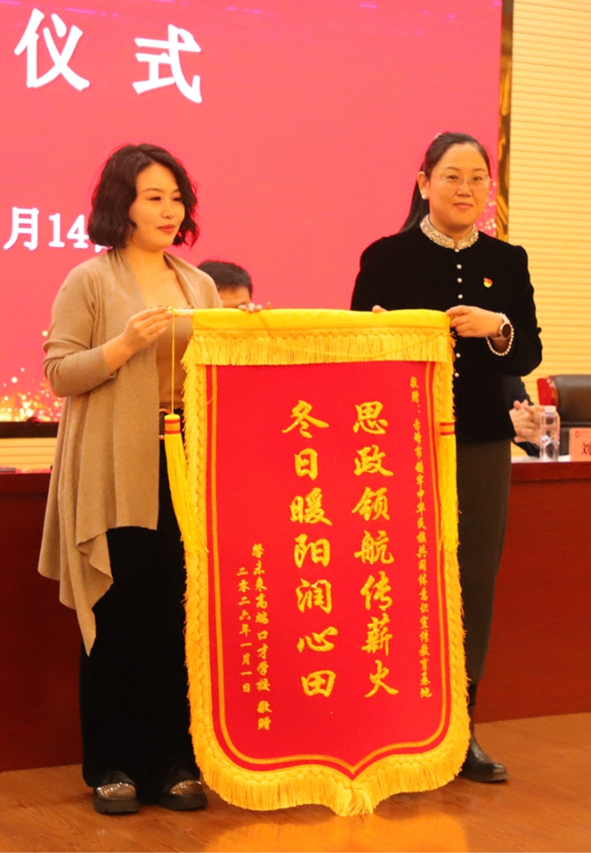 现场还举行了温馨的锦旗赠送仪式,我校优秀校友、赤峰馨未来高端口才学校校长周广馨向位于我校的赤峰市铸牢中华民族共同体意识宣传教育基地赠送了锦旗,彰显了校友反哺母校、助力青少年思政教育的深厚情谊。