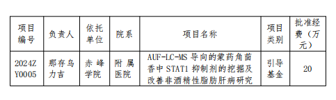 近日,从内蒙古科学技术厅获悉,我校附属医院那存乌力吉申报的“AUF-LC-MS导向的蒙药角茴香中STAT1抑制剂的挖掘及改善非酒精性脂肪肝病研究”获批2024年度中央引导地方科技发展计划项目,获批经费20万元。
