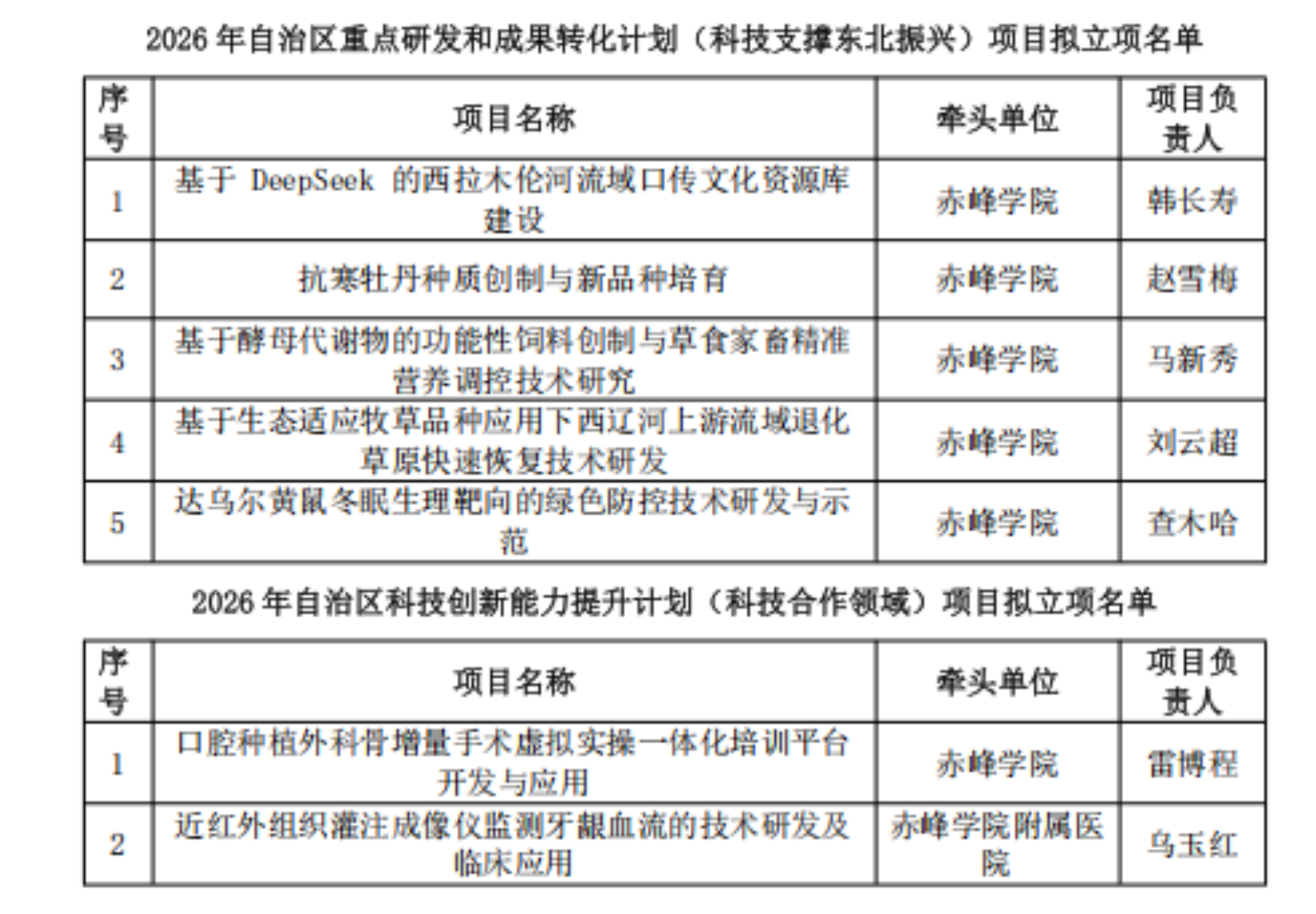 您所在当前位置: 首页 > 新闻动态 新闻动态 我校牵头拟获批7项2026年度自治区科技计划项目 时间:2026-03-17 来源: 作者: 近日,自治区科技厅公布了2026年第一批自治区重点研发和成果转化计划项目及创新能力提升计划(科技合作领域)项目拟立项名单发布,我校作为牵头单位获批7项,其中,重点研发和成果转化计划(科技支撑东北振兴)项目5项、创新能力提升计划(科技合作领域)项目2项,拟立项金额550万元,获批项目数量和经费再创新高。