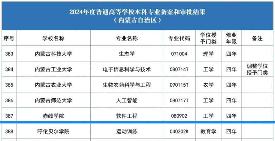 近日,教育部发布了《教育部关于公布2024年度普通高等学校本科专业备案和审批结果及〈普通高等学校本科专业目录(2025年)〉的通知》(教高函〔2025〕3号),我校获批新增四年制工学本科专业“软件工程(080902)”。至此,我校共有本科专业57个,理工农医类专业占比持续上升。今后,学校将继续按照教育部等五部门印发的《普通高等教育学科专业设置调整优化改革方案》(教高〔2023〕1号)有关要求及《赤峰学院本科专业设置与优化调整管理办法》(赤院院字〔2024〕17号),持续优化专业结构,进一步提升专业设置与社会需求的契合度。