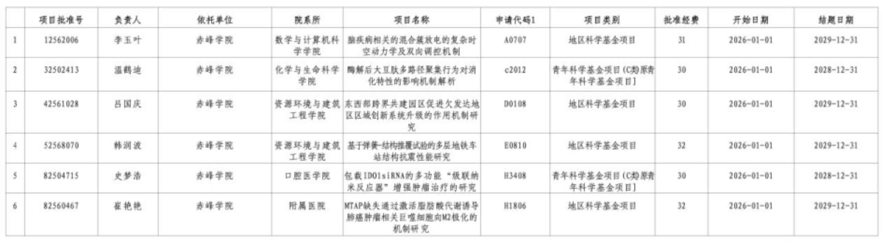 8月27日,国家自然科学基金委员会公布了《关于2025年国家自然科学基金集中接收申请项目评审结果的通告》,我校数学与计算机科学学院李玉叶,资源环境与建筑工程学院吕国庆、韩润波和赤峰学院附属医院崔艳艳申报的项目获批“地区科学基金”项目;化学与生命科学学院温鹤迪、口腔医学院史梦浩申报的项目获批“青年科学基金(C类)”项目。本年度获批的6个项目总资助经费185万元。