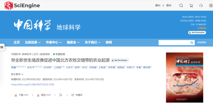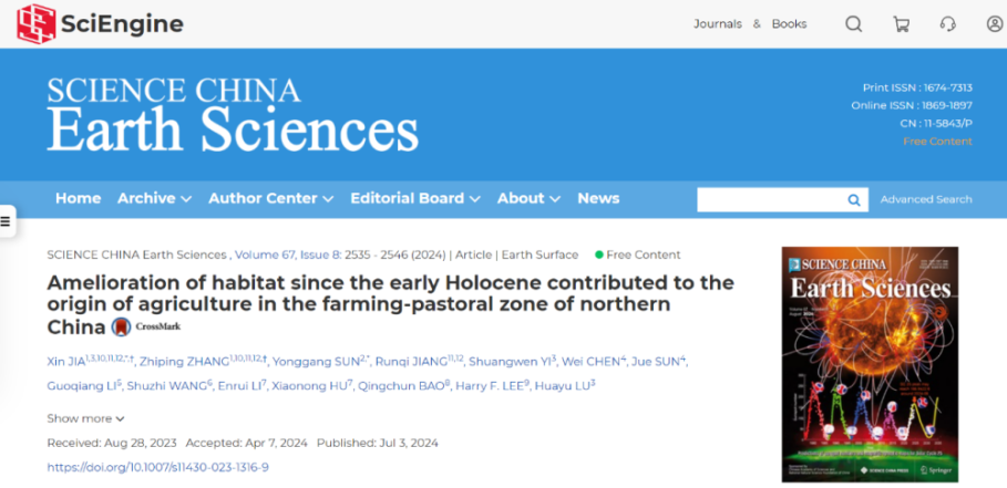 近日,《中国科学·地球科学》《Science China Earth Sciences》中英文两版同步刊发了《早全新世生境改善促进中国北方农牧交错带的农业起源》(《Amelioration of habitat since the early Holocene contributed to the origin of agriculture in the farming-pastoral zone of northern China》)的研究论文。该成果对属于裕民文化的裕民、坝南遗址的沉积剖面开展了石英光释光测年,在裕民遗址发掘过程中采集土壤样品开展了植物浮选和碳化植物种子鉴定,对前述各沉积剖面进行了孢粉、磁化率、粒度和化学元素等多指标分析,获得了全新世农业活动和气候变化的信息,并结合已发表的裕民文化圈周边高分辨率的古环境记录,探讨了中国北方农业起源与气候变化的关系,揭示了中国北方粟作农业起源和发展的机制。
