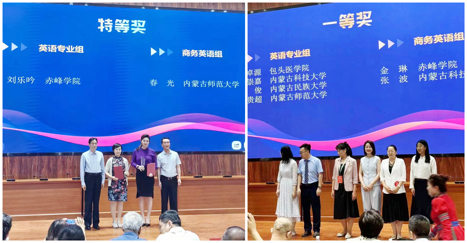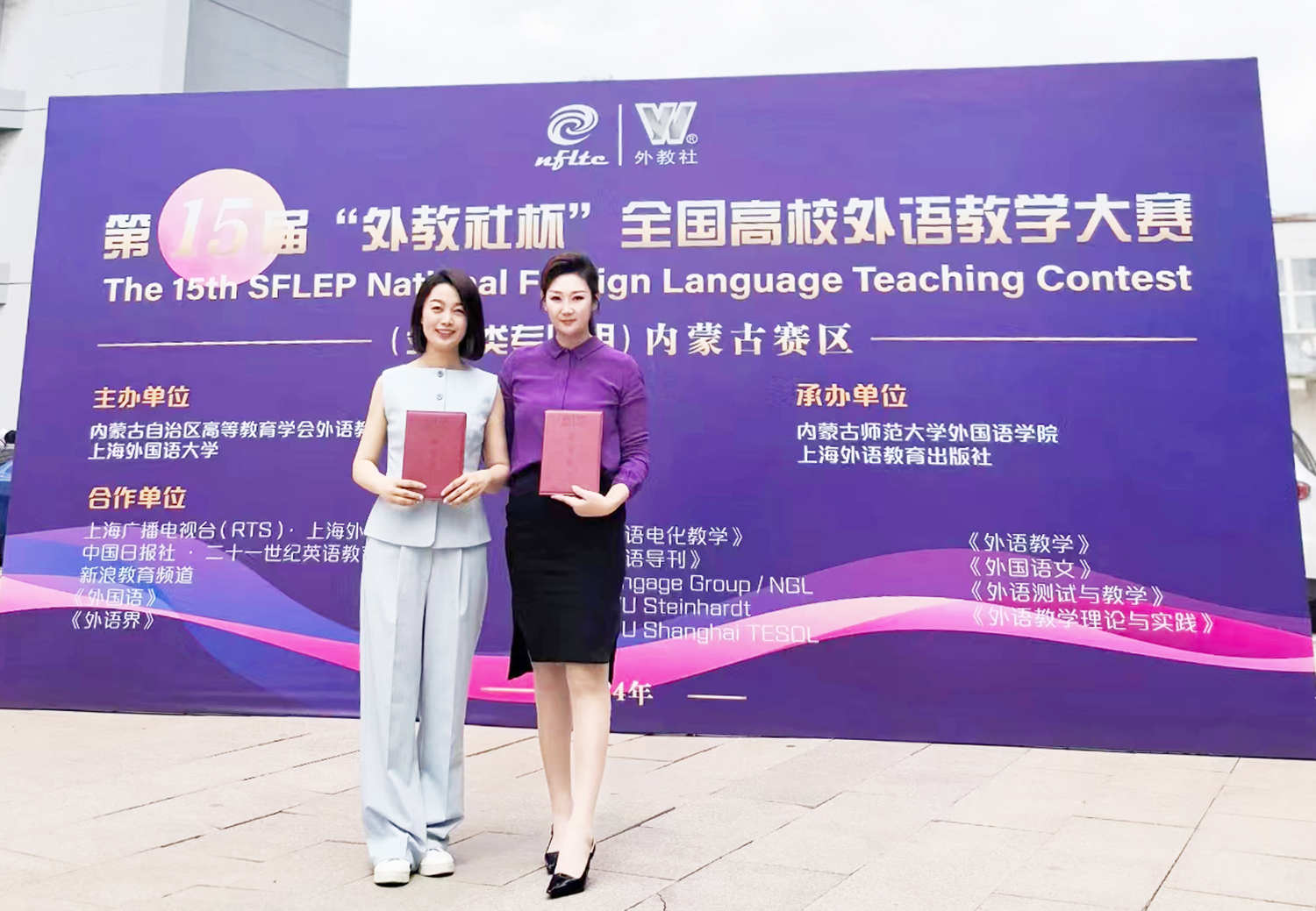 近日,由内蒙古自治区高等教育学会外语教学与研究分会、上海外国语大学主办,内蒙古师范大学外国语学院、上海外语教育出版社承办的第十五届“外教社杯”全国高校外语教学大赛(内蒙古赛区)圆满落幕。经过激烈角逐,我校外国语学院两位老师喜获佳绩,其中,刘乐吟老师荣获专业英语组特等奖,将代表内蒙古高校参加国赛比拼;金琳老师荣获商务英语组一等奖。两位老师优异成绩的取得,体现了我校教师治学严谨、以赛促强、奋力拼搏的精神!