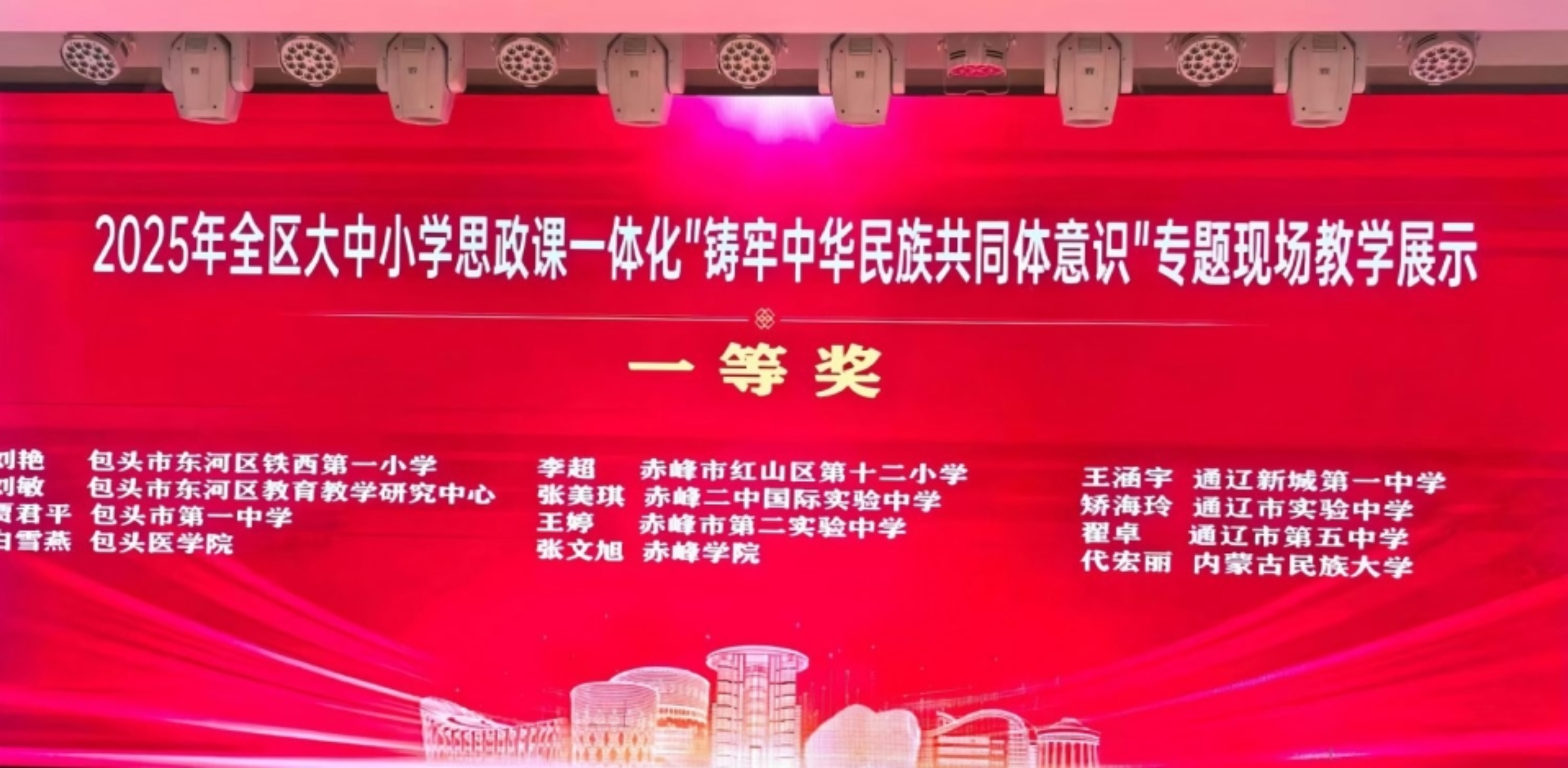 7月19日,由内蒙古自治区教育厅主办的全区大中小学思政课一体化专题现场教学展示活动落幕。由我校牵头组建的大中小学思政课一体化团队在“铸牢中华民族共同体意识”专题决赛中,以“追寻红山文化源 铸牢华夏自信魂”为主题,凭借精准的学段衔接与创新的教学设计,喜获一等奖,实现了我校在该领域省级赛事一等奖的突破;在“习近平新时代中国特色社会主义思想”专题决赛中,以“践生态思想 守北疆屏障”为主题,喜获二等奖。