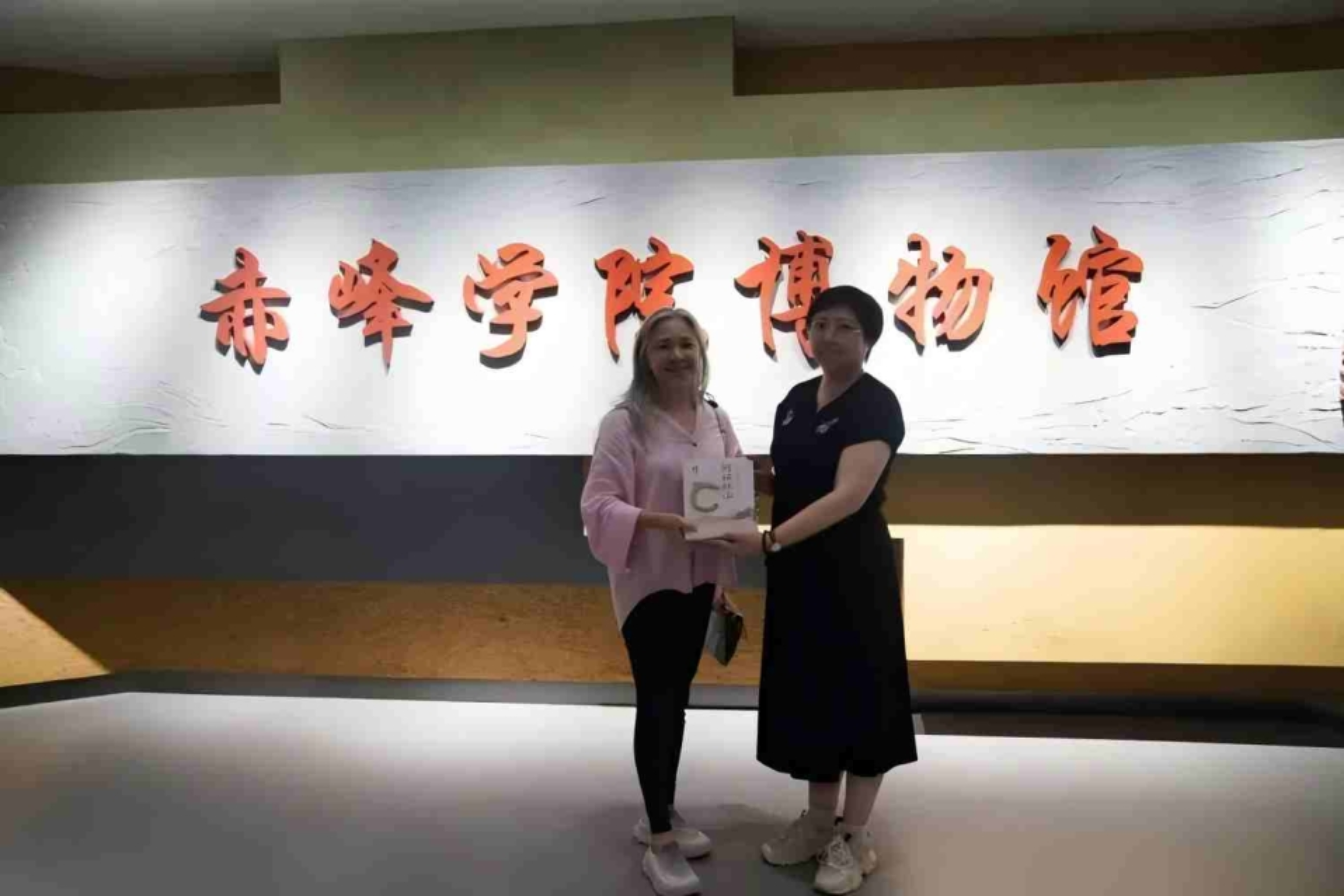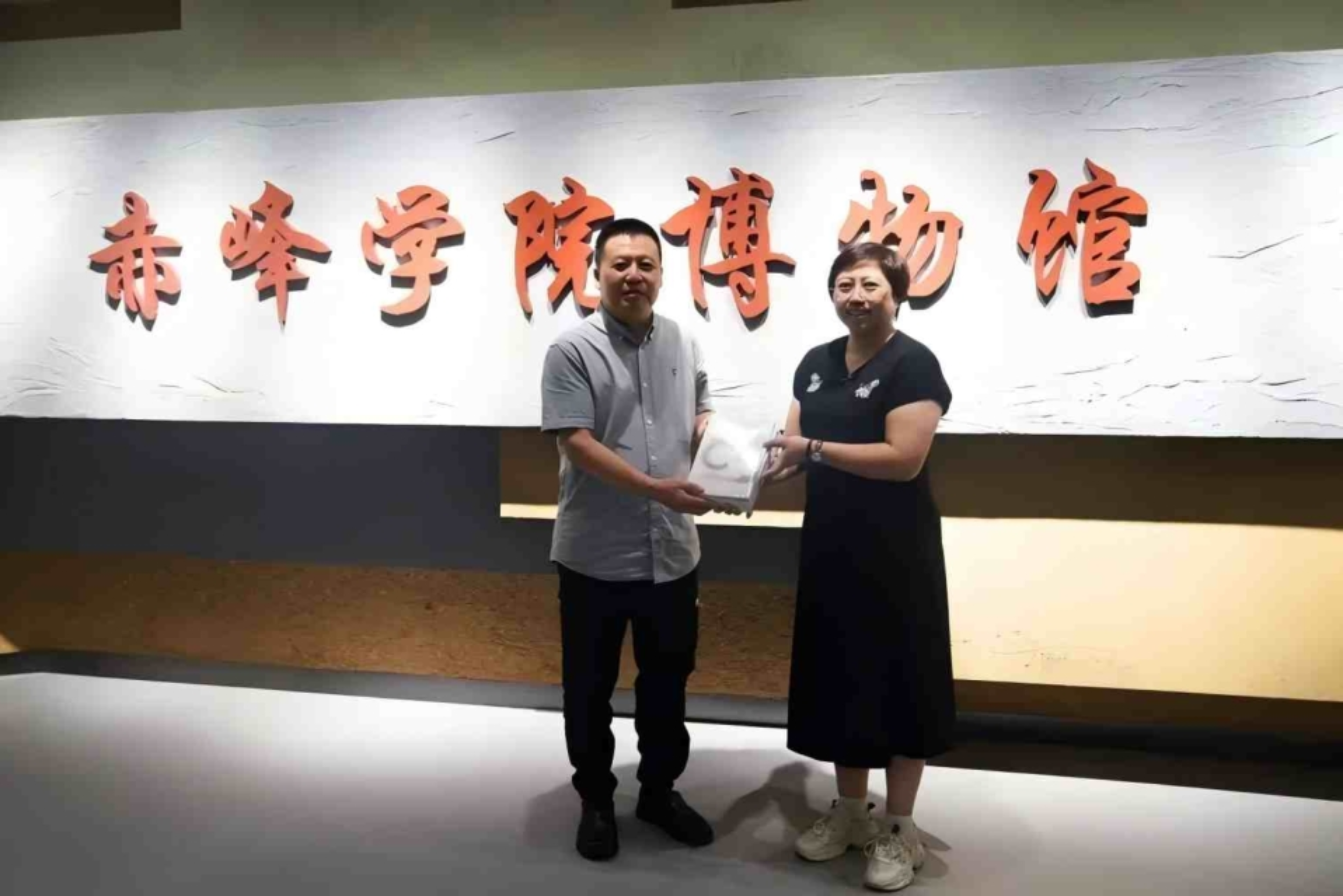 在学校博物馆,成员们认真聆听了历史文化学院任君宇老师的讲解,系统参观了博物馆内的展品,并且就红山文化的考古新发现等话题与赤峰学院学生展开互动交流。成员们纷纷表示,此次赤峰学院之行不仅使他们加深了对红山文化的理解,更感受到了多民族文化在这片土地上共生共荣的深厚底蕴。学校为成员赠送了文创小礼品和丛书《“红山文化”100年》。