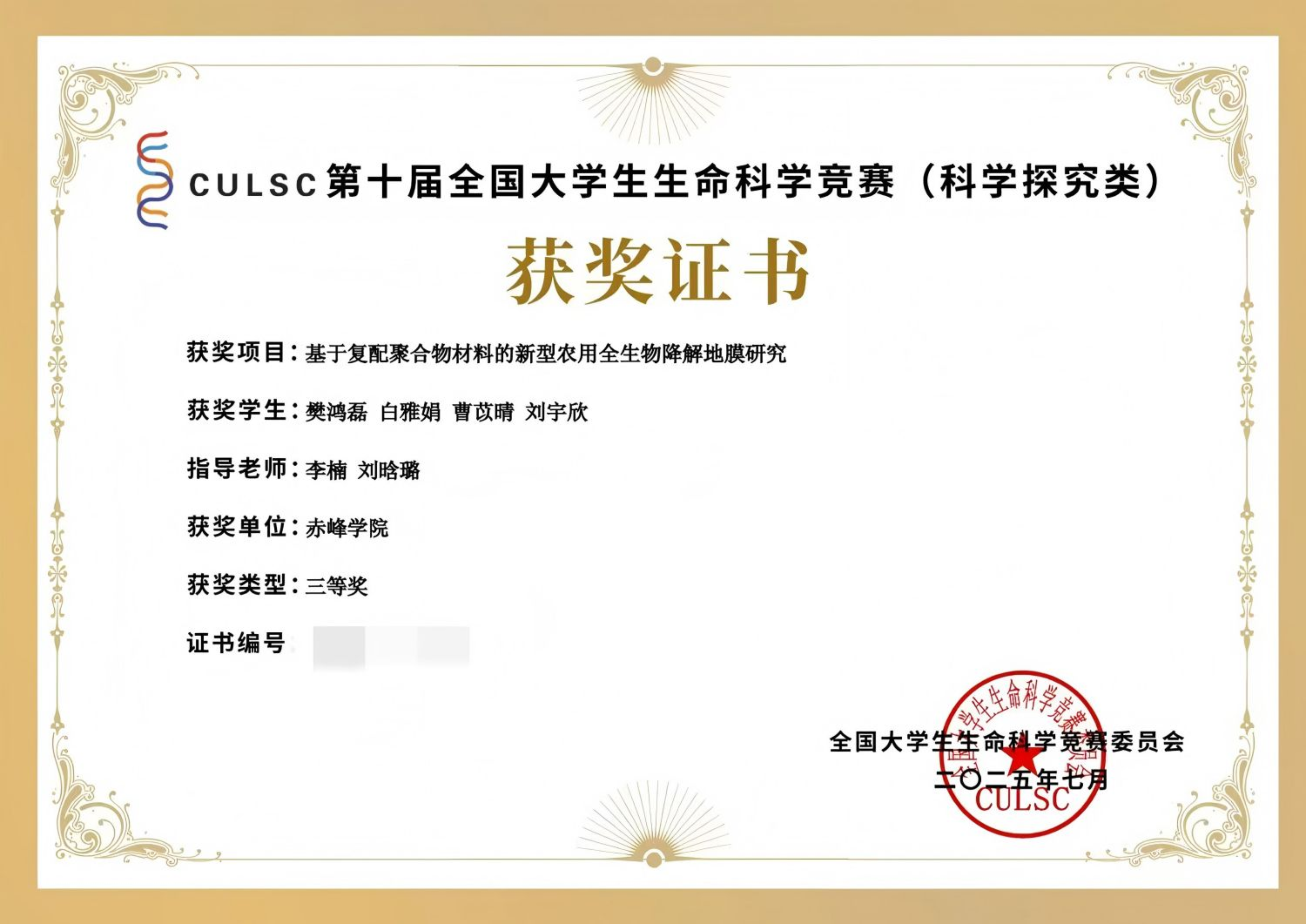 近日,第十届全国大学生生命科学竞赛(科学探究类)决赛结果揭晓。由农学院教师李楠、刘晗璐指导,学生樊鸿磊、白雅娟、曹苡晴、刘宇欣共同完成的项目《基于复配聚合物材料的新型农用全生物降解地膜研究》荣获国家级三等奖。