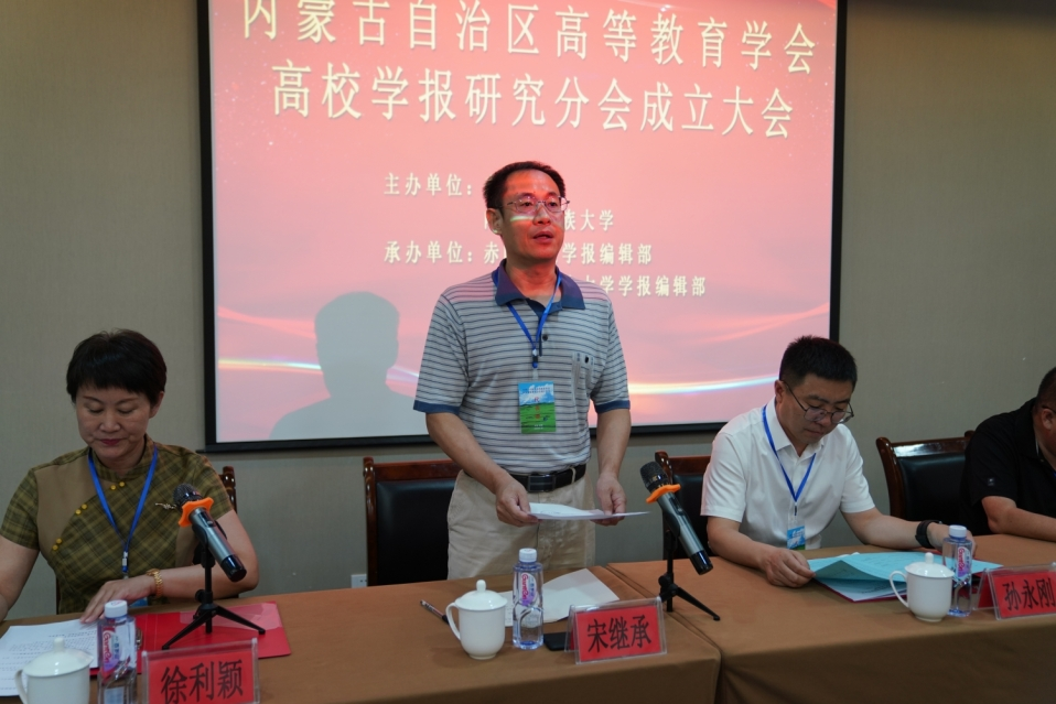 会上,孙永刚副校长介绍了赤峰市和赤峰学院的发展情况;内蒙古财经大学学报编辑部主任宋继承宣读了内蒙古自治区高等教育学会批复文件;内蒙古民族大学学报编辑部主任徐寿军宣读了吉林高校学报研究会、辽宁高校学报研究会贺信;《赤峰学院学报》主编、研究分会理事长孙国军介绍了成立高校学报研究会的目的和意义,表示研究会旨在整合资源、加强交流、推动创新,提升高校学报的整体质量和影响力。