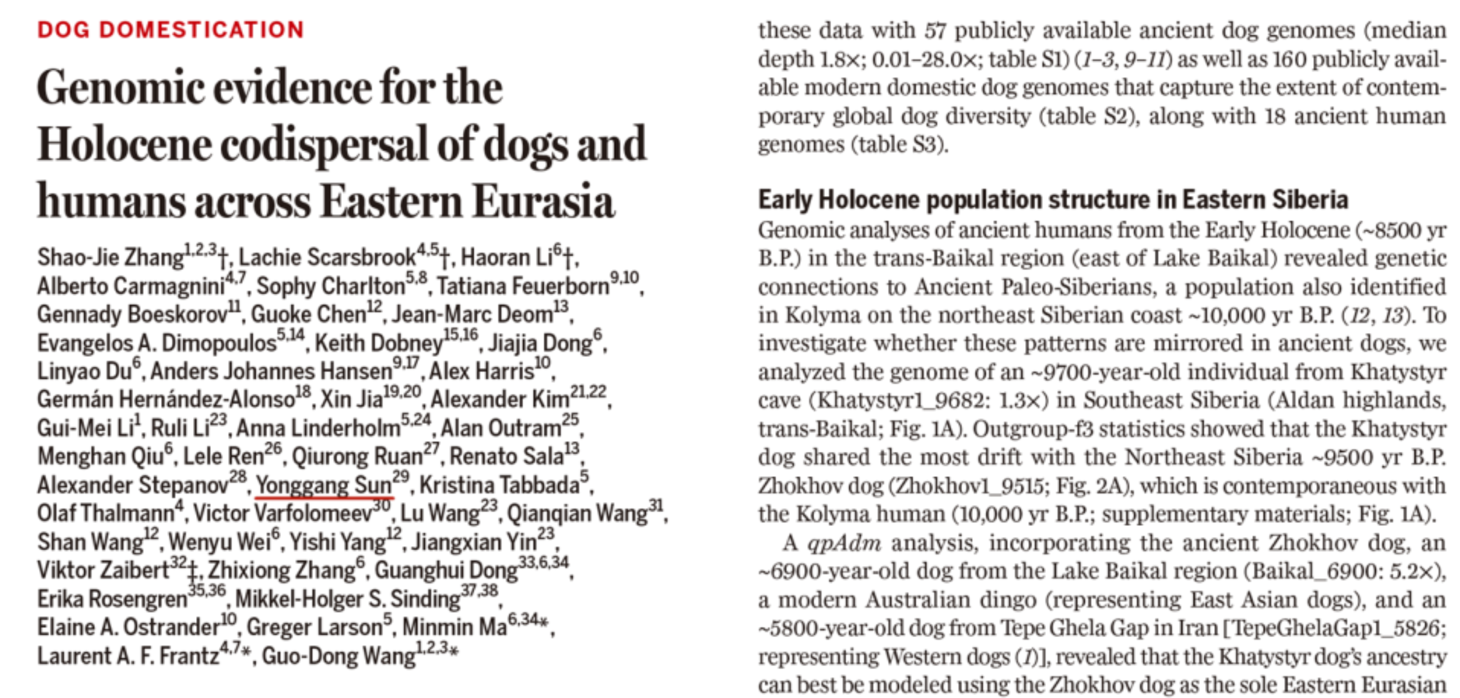 11月14日,由中科院昆明动物研究所张少杰研究员团队牵头,我校材料分析与科技考古重点实验室孙永刚教授团队参与,联合慕尼黑大学、云南大学、牛津大学、甘肃省文物考古研究所、青海省文物考古研究院、新疆文物考古研究所、南京师范大学、昭通学院和中国科学院地球环境研究所等单位合作发表的“Genomic evidence for the Holocene co-dispersal of dogs and humans across Eastern Eurasia”论文登上《Science》。