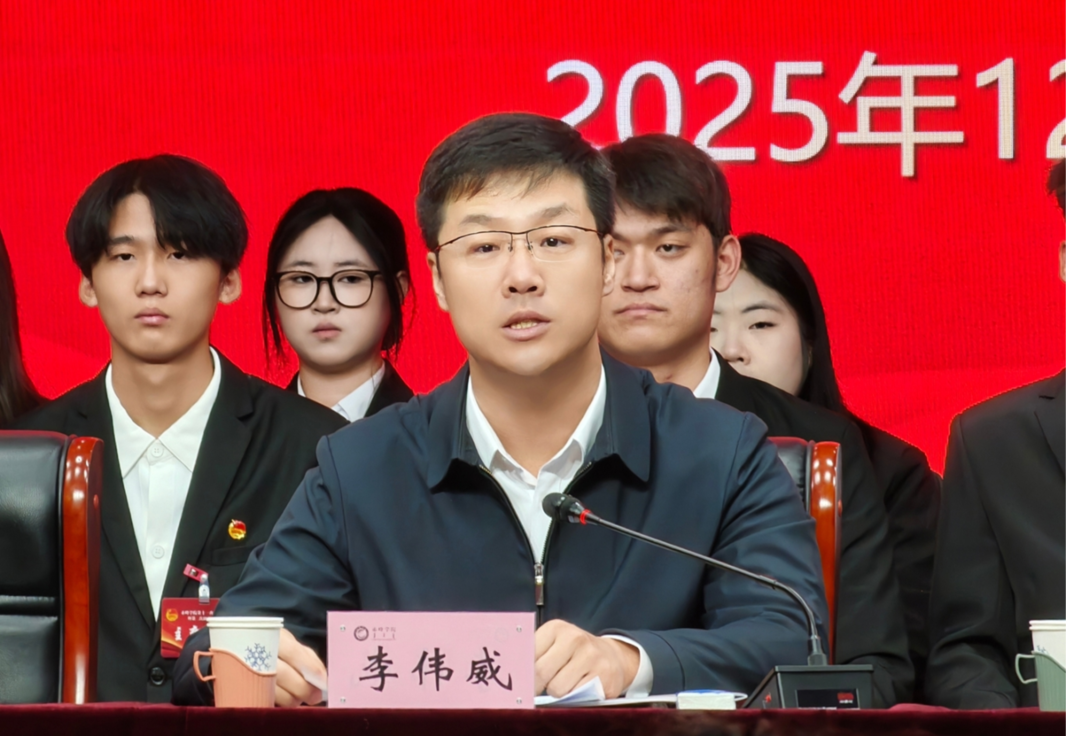李伟威副书记代表学校党委致辞,对大会的胜利召开表示祝贺,并对团学工作成绩给予充分肯定。他指出,过去一年,学生组织在思想引领、学风建设、校园文化等方面取得显著成效,是学校高质量发展的重要力量。希望与会代表们以“强国有我”的信念铸魂立心,在坚定理想中把准人生航向;以“求知若渴”的姿态笃学精进,在练就本领中夯实成才基础;以“守正创新”的作风凝聚力量,在服务同学中践行责任担当。同时,李伟威副书记还对团学工作提出新的要求,强调团总支要主动担当作为,党总支要压实岗位责任,校团委要强化统筹引领。最后,他还希望全体青年以主人翁姿态投身学校发展,在强国建设、民族复兴中贡献青春力量。