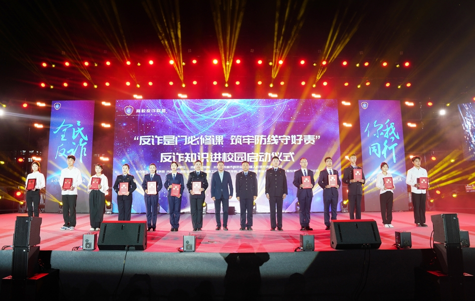 仪式上,宋可钦副书记致欢迎辞,吴显明副行长讲话;韩来风副局长和吴显明副行长共同为12名反诈宣讲员颁发聘书;与会领导共同按下启动柱,启动“反诈知识进校园”活动。