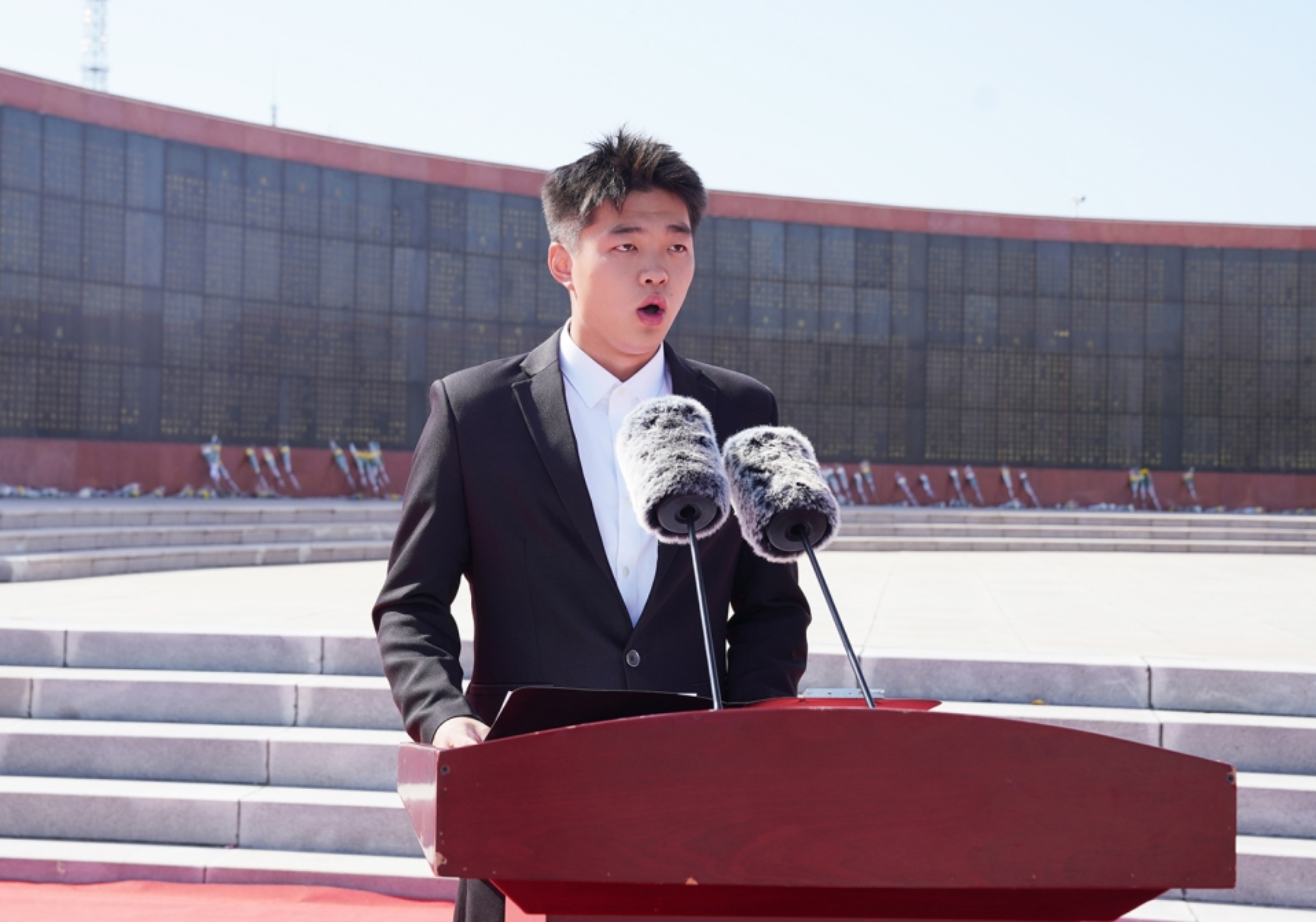 郁郁松柏掩忠骨,烈烈英魂诉长风。祭扫期间,全体人员肃立,齐唱中华人民共和国国歌,激昂旋律在陵园上空回荡,每一句歌词都凝聚着师生对祖国的赤诚与对英烈的追思;国歌奏毕,师生们共同为牺牲的革命烈士默哀并鞠躬,用无声的仪式告慰英烈忠魂;大学生国旗护卫队手捧花篮稳步走向纪念碑,将承载着深切缅怀之情的花篮敬献于碑前,党委副书记、校长季祥缓步上前,仔细整理花篮缎带;历史文化学院2022级考古学专业的宋明达作为学生代表发言,结合英烈事迹,讲述了新时代青年的责任担当,真挚的话语引发在场人员强烈共鸣,让英烈精神在交流中进一步传递。