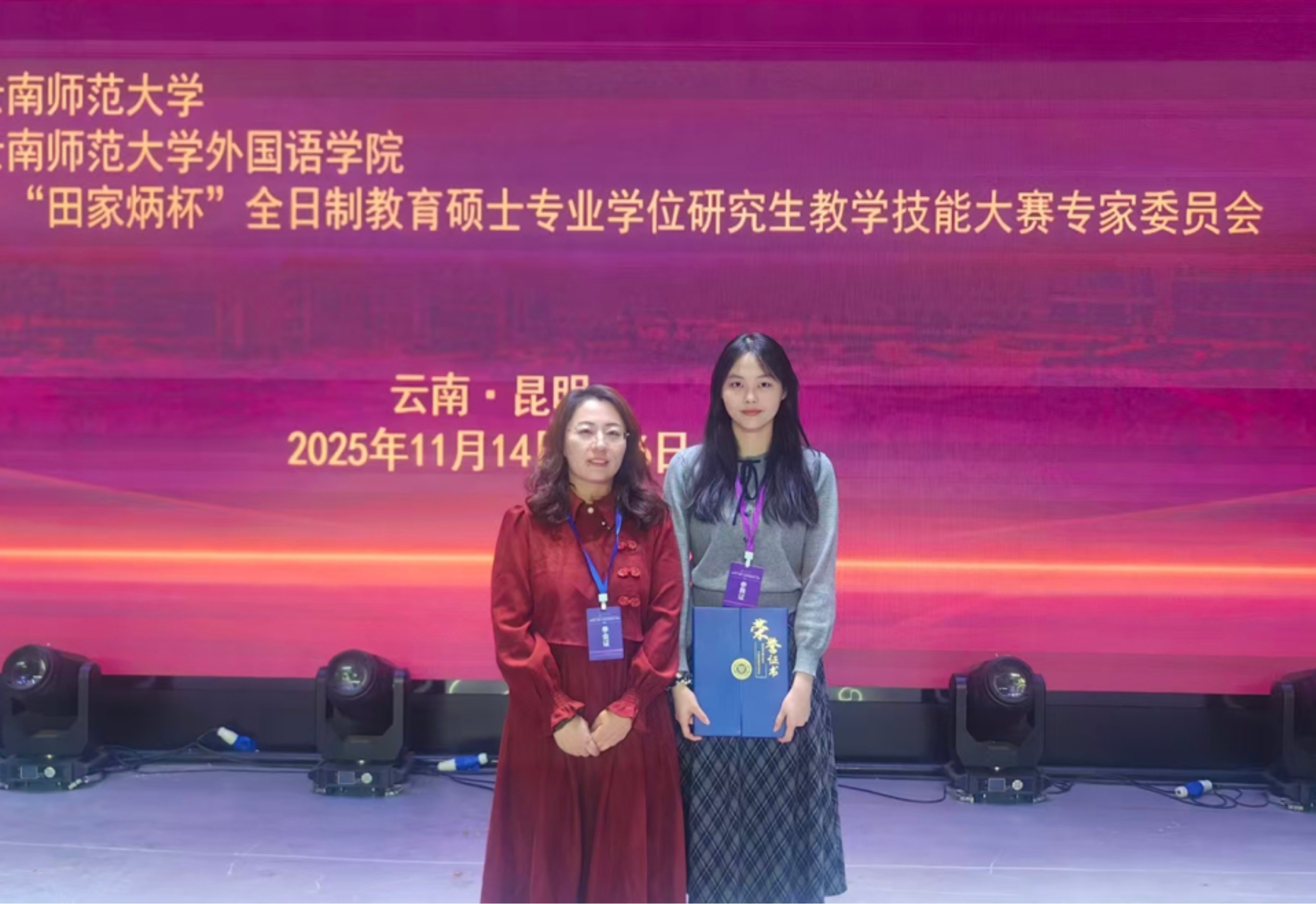 11月14日至16日,2025年全国“田家炳杯”全日制教育硕士专业学位研究生学科教学(英语)专业教学技能大赛决赛在云南师范大学顺利举行,我校外国语学院学科教学(英语)专业研究生陈昕远荣获“优秀教学设计奖”。