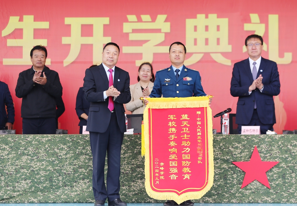 王怀栋校长代表全校师生向承训部队赠送了锦旗;与会校领导为新生代表佩戴了校徽。