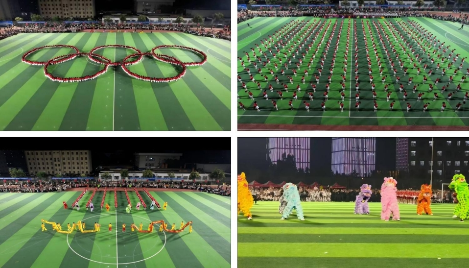 开幕式表演环节,绿茵草地上,表演精彩纷呈。大型团体操整齐划一,气势恢宏;舞龙、狮舞灵动矫健,活力四射;跳绳表演花样繁多,令人赞叹;武术表演刚劲有力,尽显风采;安代舞热情奔放,极具民族特色;大型健美操动感十足,洋溢青春气息,点燃全场激情。