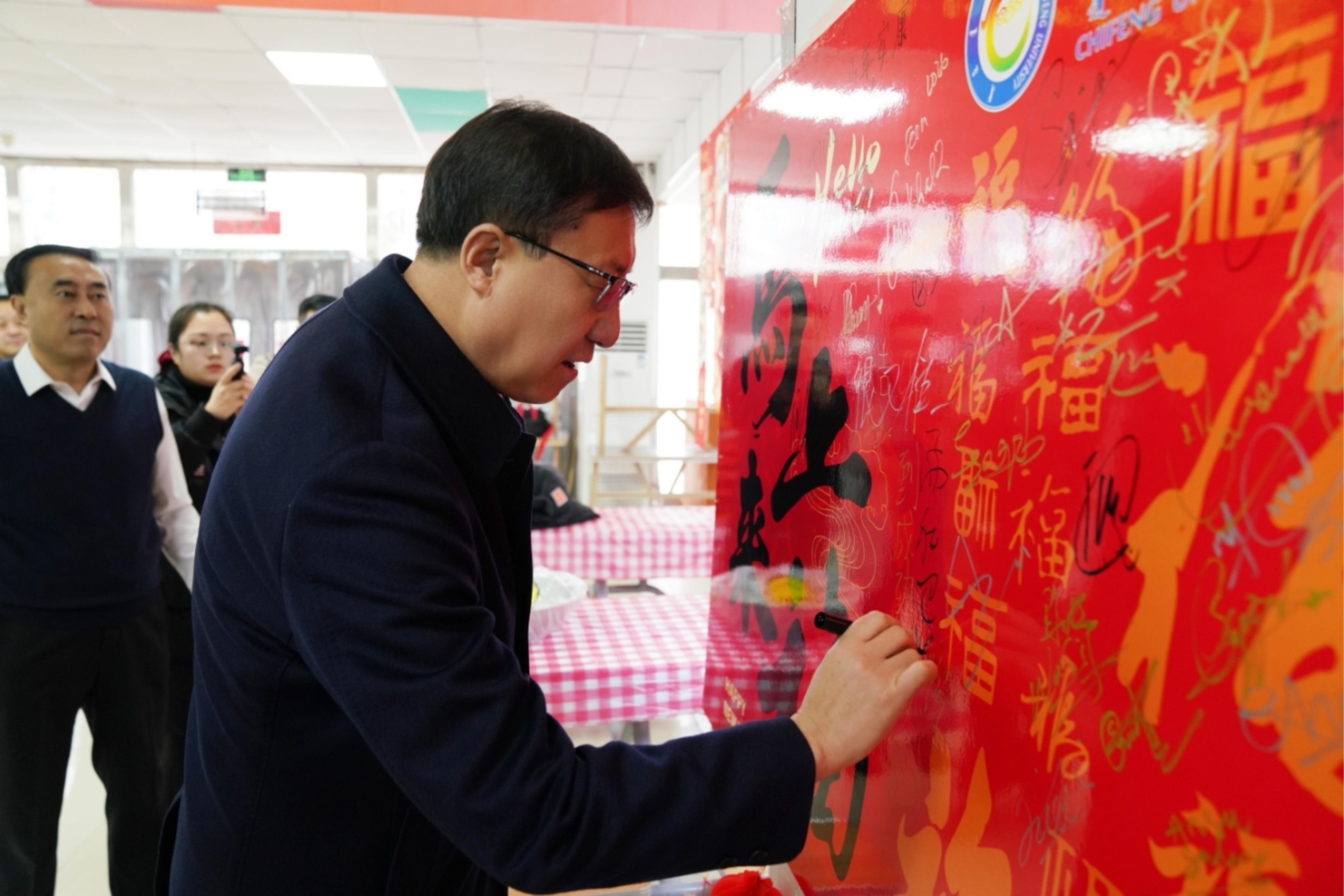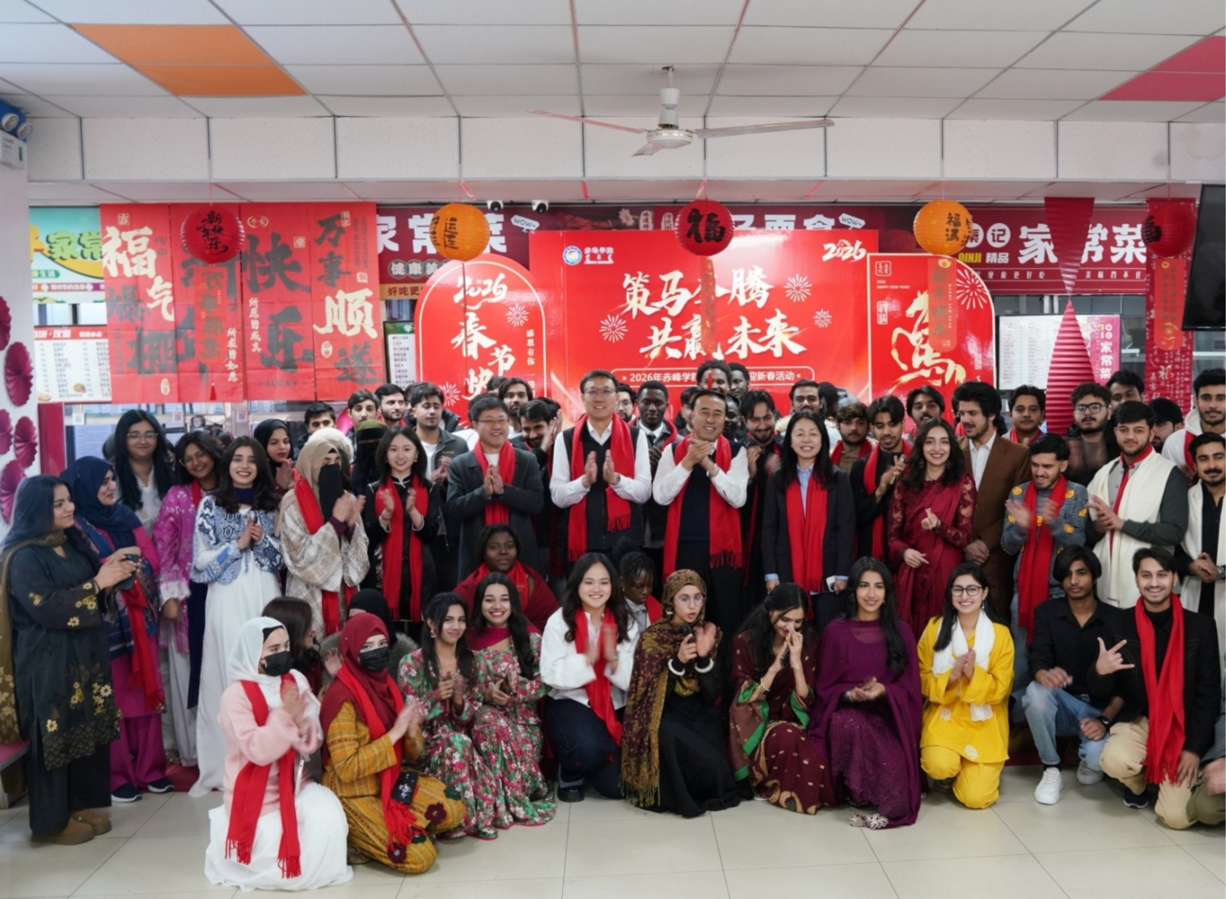 2月11日下午,校党委书记孟和巴特尔,党委委员、副校长徐振军慰问留校来华留学生,并与国际教育学院全体教职工及来自19个国家的来华留学生欢聚一堂,共迎新春。国际教育学院党总支书记任振涛主持庆祝活动。