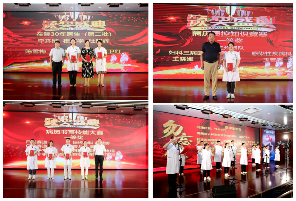 表彰大会上,杨占君副校长为在医院工作30年医生颁奖;附属医院党委书记李占则、院长韩旭晨分别为病历质控知识竞赛获奖医生、2023年优秀MDT团队和病历书写技能大赛、“三基三严”技能大赛获奖医生颁奖。