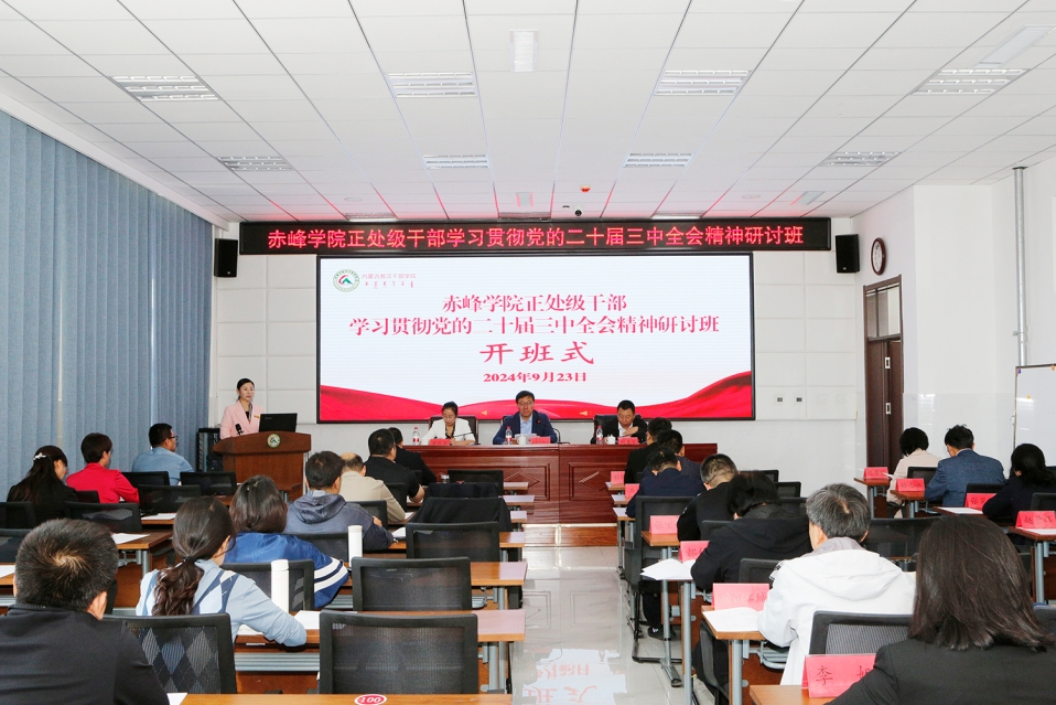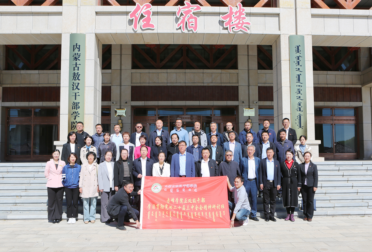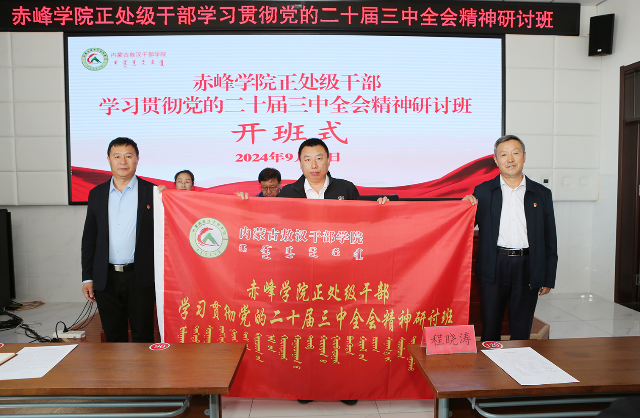 按照学校党委安排部署,9月23日上午,我校在敖汉干部学院举办第一期正处级领导干部学习贯彻习近平新时代中国特色社会主义思想和党的二十届三中全会精神研讨班。我校党委书记孟和巴特尔,敖汉干部学院院长周春军、副院长黄秋丽出席开班仪式。36名正处级干部及主持工作的部门单位负责同志参加第一期培训。黄秋丽副院长主持开班式。